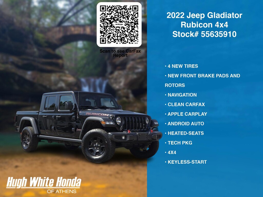 Our Car Dealership in Athens, OH: Call Hugh White Athens today at (844) 859-8630 TO SCHEDULE YOUR TEST DRIVE of this 2022 Jeep Gladiator Rubicon 4x4. You can also visit us at 250 Columbus Road. Athens, OH 45701 to check it out in person! Our Hugh White Athens Used car dealership only sells used cars Athens, OH buyers can trust for safety and worry free driving.