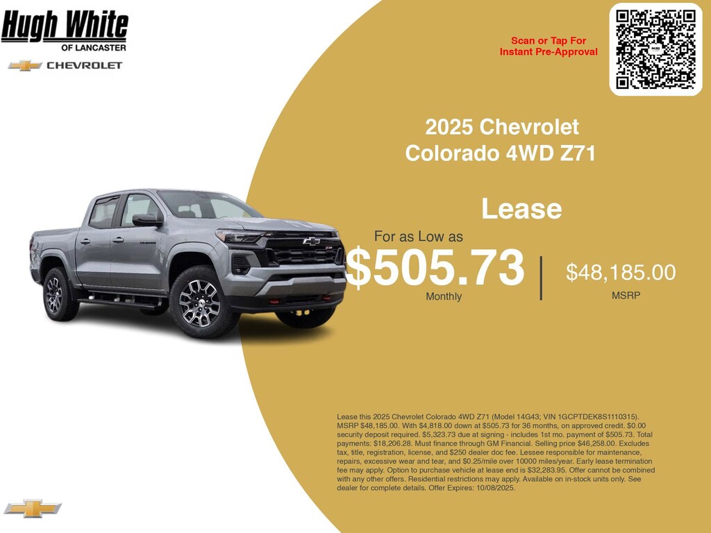 GM lease offers leverage the benefits of GM Financial, along with current Chevrolet Colorado 4WD Z71 rebates, and incentives available. PLUS, we have 3 other Colorado 4WD Z71 options for Lancaster's best selection. Call or drive in for Chevrolet lease deals like this attractive 2025 Chevrolet Colorado with lease options near Lancaster! This Colorado is also available for sale near Pickerington, Circleville, and Logan. These GM lease offers end 10/8/2025 Disclaimer: Lease this 2025 Chevrolet Colorado 4WD Z71 (Model 14G43; VIN 1GCPTDEK8S1110315). MSRP $48,185.00. With $4,818.00 down at $505.73 for 36 months, on approved credit. $0.00 security deposit required. $5,323.73 due at signing - includes 1st mo. payment of $505.73. Total payments: $18,206.28. Must finance through GM Financial. Selling price $46,258.00. Excludes tax, title, registration, license, and $250 dealer doc fee. Lessee responsible for maintenance, repairs, excessive wear and tear, and $0.25/mile over 10000 miles/year. Early lease termination fee may apply. Option to purchase vehicle at lease end is $32,283.95. Offer cannot be combined with any other offers. Residential restrictions may apply. Available on in-stock units only. See dealer for complete details. Offer Expires: 10/08/2025.