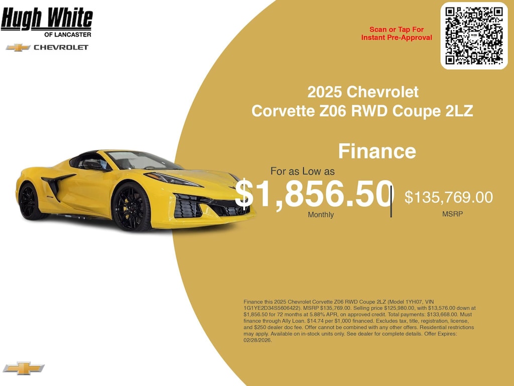 Take advantage of GM Financial programs and Chevrolet Corvette Z06 RWD Coupe 2LZ incentives today. PLUS, choose from 1 more Corvette Z06 RWD Coupe 2LZ options for Lancasterâs best lineup. Finance specials end 2/28/2026. Disclaimer: Finance this 2025 Chevrolet Corvette Z06 RWD Coupe 2LZ (Model 1YH07, VIN 1G1YE2D34S5606422). MSRP $135,769.00. Selling price $125,980.00, with $13,576.00 down at $1,856.50 for 72 months at 5.88% APR, on approved credit. Total payments: $133,668.00. Must finance through Ally Loan. $14.74 per $1,000 financed. Excludes tax, title, registration, license, and $250 dealer doc fee. Offer cannot be combined with any other offers. Residential restrictions may apply. Available on in-stock units only. See dealer for complete details. Offer Expires: 02/28/2026.