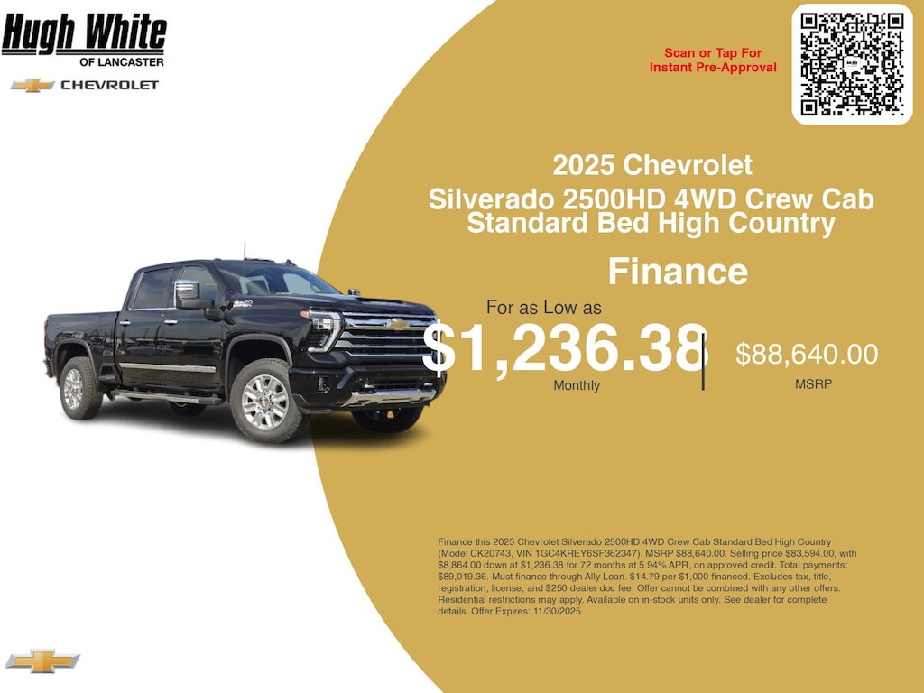 Take advantage of GM Financial programs and Chevrolet Silverado 2500HD 4WD Crew Cab Standard Bed High Country incentives today. PLUS, choose from 1 more Silverado 2500HD 4WD Crew Cab Standard Bed High Country options for Lancasterâs best lineup. Finance specials end 11/30/2025. Disclaimer: Finance this 2025 Chevrolet Silverado 2500HD 4WD Crew Cab Standard Bed High Country (Model CK20743, VIN 1GC4KREY6SF362347). MSRP $88,640.00. Selling price $83,594.00, with $8,864.00 down at $1,236.38 for 72 months at 5.94% APR, on approved credit. Total payments: $89,019.36. Must finance through Ally Loan. $14.79 per $1,000 financed. Excludes tax, title, registration, license, and $250 dealer doc fee. Offer cannot be combined with any other offers. Residential restrictions may apply. Available on in-stock units only. See dealer for complete details. Offer Expires: 11/30/2025.