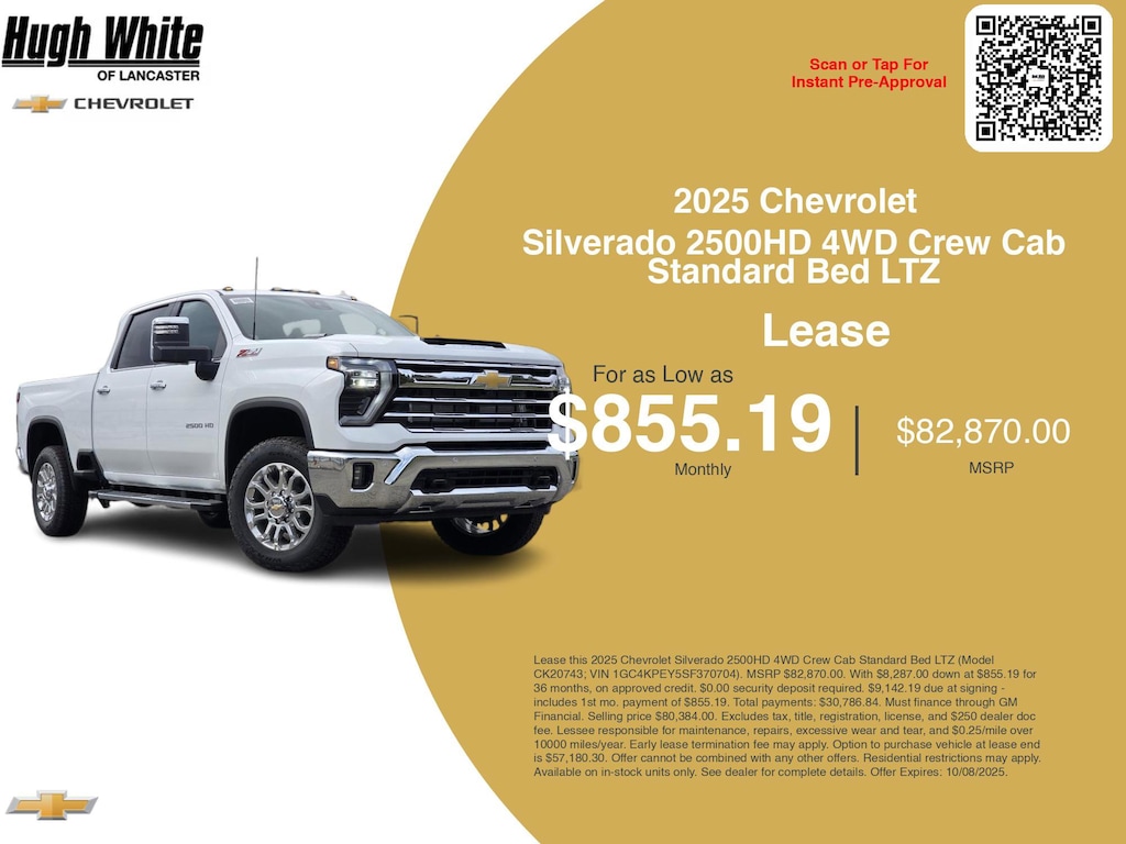 GM lease offers leverage the benefits of GM Financial, along with current Chevrolet Silverado 2500HD 4WD Crew Cab Standard Bed LTZ rebates, and incentives available. PLUS, we have 2 other Silverado 2500HD 4WD Crew Cab Standard Bed LTZ options for Lancaster's best selection. Call or drive in for Chevrolet lease deals like this attractive 2025 Chevrolet Silverado 2500HD with lease options near Lancaster! This Silverado 2500HD is also available for sale near Pickerington, Circleville, and Logan. These GM lease offers end 10/8/2025 Disclaimer: Lease this 2025 Chevrolet Silverado 2500HD 4WD Crew Cab Standard Bed LTZ (Model CK20743; VIN 1GC4KPEY5SF370704). MSRP $82,870.00. With $8,287.00 down at $855.19 for 36 months, on approved credit. $0.00 security deposit required. $9,142.19 due at signing - includes 1st mo. payment of $855.19. Total payments: $30,786.84. Must finance through GM Financial. Selling price $80,384.00. Excludes tax, title, registration, license, and $250 dealer doc fee. Lessee responsible for maintenance, repairs, excessive wear and tear, and $0.25/mile over 10000 miles/year. Early lease termination fee may apply. Option to purchase vehicle at lease end is $57,180.30. Offer cannot be combined with any other offers. Residential restrictions may apply. Available on in-stock units only. See dealer for complete details. Offer Expires: 10/08/2025.