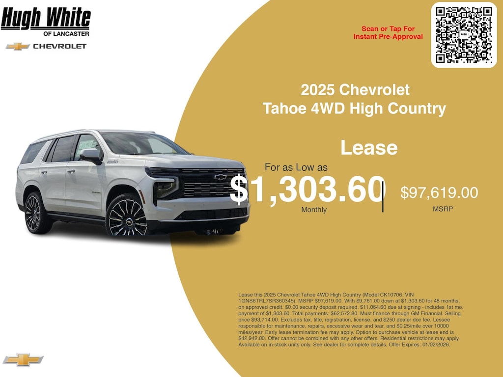 Our GM lease offers combine GM Financial benefits with current Chevrolet Tahoe 4WD High Country incentives. PLUS, explore 1 more Tahoe 4WD High Country options for Lancasterâs best selection. Hurry these GM lease specials end 1/2/2026. Lease this 2025 Chevrolet Tahoe 4WD High Country (Model CK10706; VIN 1GNS6TRL7SR360345). MSRP $97,619.00. With $9,761.00 down at $1,303.60 for 48 months, on approved credit. $0.00 security deposit required. $11,064.60 due at signing - includes 1st mo. payment of $1,303.60. Total payments: $62,572.80. Must finance through GM Financial. Selling price $93,714.00. Excludes tax, title, registration, license, and $250 dealer doc fee. Lessee responsible for maintenance, repairs, excessive wear and tear, and $0.25/mile over 10000 miles/year. Early lease termination fee may apply. Option to purchase vehicle at lease end is $42,942.00. Offer cannot be combined with any other offers. Residential restrictions may apply. Available on in-stock units only. See dealer for complete details. Offer Expires: 01/02/2026.