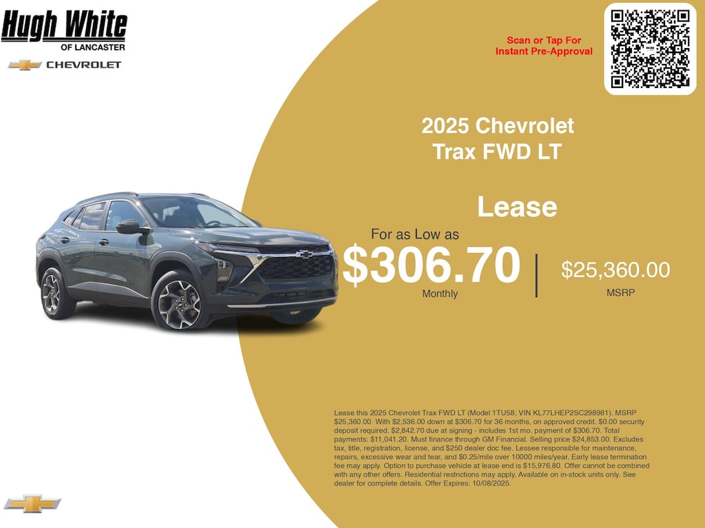 GM lease offers leverage the benefits of GM Financial, along with current Chevrolet Trax FWD LT rebates, and incentives available. PLUS, we have 5 other Trax FWD LT options for Lancaster's best selection. Call or drive in for Chevrolet lease deals like this attractive 2025 Chevrolet Trax with lease options near Lancaster! This Trax is also available for sale near Pickerington, Circleville, and Logan. These GM lease offers end 10/8/2025 Disclaimer: Lease this 2025 Chevrolet Trax FWD LT (Model 1TU58; VIN KL77LHEP2SC298981). MSRP $25,360.00. With $2,536.00 down at $306.70 for 36 months, on approved credit. $0.00 security deposit required. $2,842.70 due at signing - includes 1st mo. payment of $306.70. Total payments: $11,041.20. Must finance through GM Financial. Selling price $24,853.00. Excludes tax, title, registration, license, and $250 dealer doc fee. Lessee responsible for maintenance, repairs, excessive wear and tear, and $0.25/mile over 10000 miles/year. Early lease termination fee may apply. Option to purchase vehicle at lease end is $15,976.80. Offer cannot be combined with any other offers. Residential restrictions may apply. Available on in-stock units only. See dealer for complete details. Offer Expires: 10/08/2025.