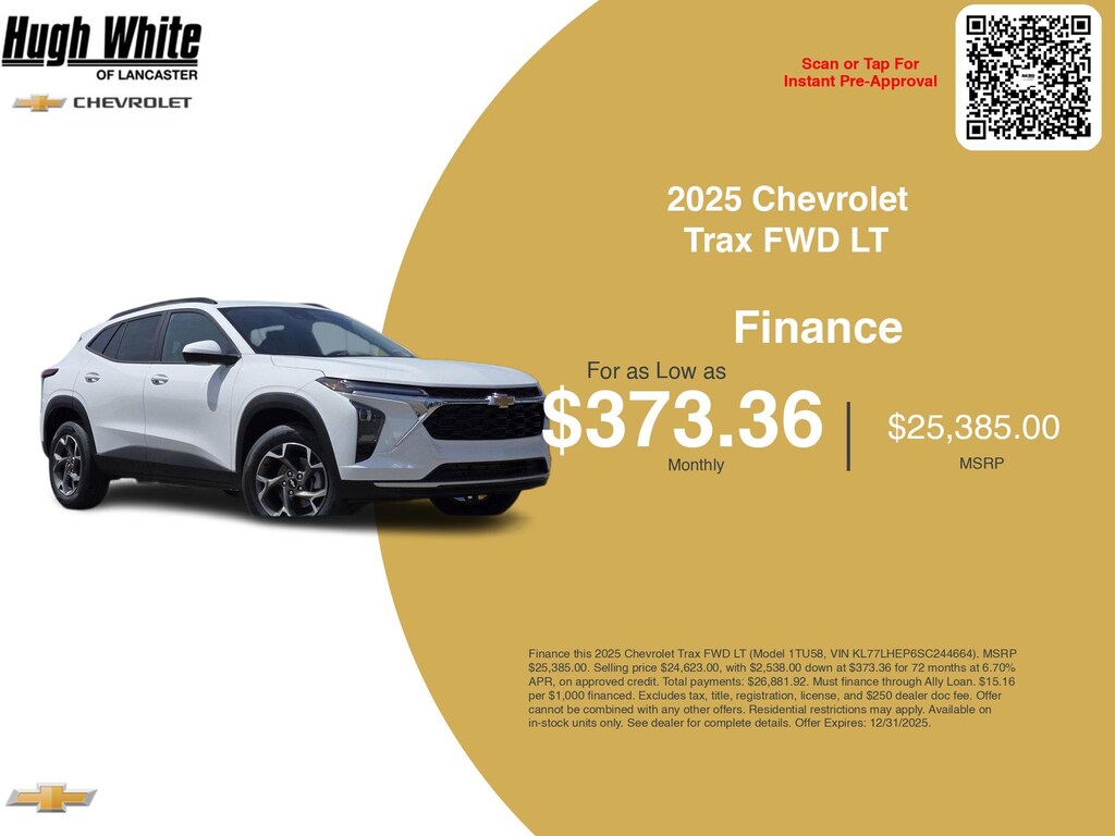 Take advantage of GM Financial programs and Chevrolet Trax FWD LT incentives today. PLUS, choose from 8 more Trax FWD LT options for Lancasterâs best lineup. Finance specials end 12/31/2025. Disclaimer: Finance this 2025 Chevrolet Trax FWD LT (Model 1TU58, VIN KL77LHEP6SC244664). MSRP $25,385.00. Selling price $24,623.00, with $2,538.00 down at $373.36 for 72 months at 6.70% APR, on approved credit. Total payments: $26,881.92. Must finance through Ally Loan. $15.16 per $1,000 financed. Excludes tax, title, registration, license, and $250 dealer doc fee. Offer cannot be combined with any other offers. Residential restrictions may apply. Available on in-stock units only. See dealer for complete details. Offer Expires: 12/31/2025.