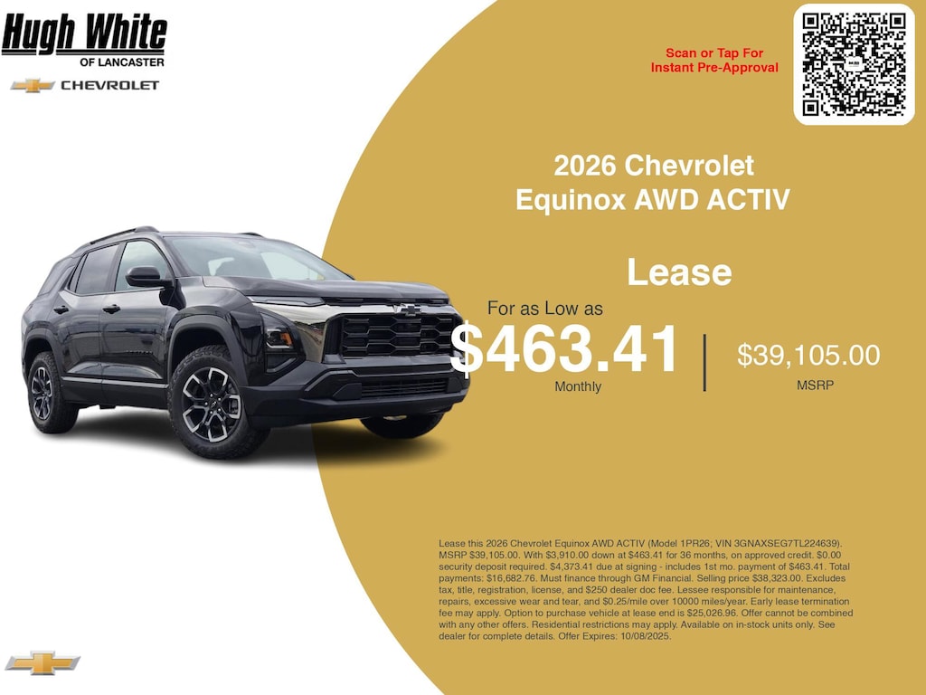 GM lease offers leverage the benefits of GM Financial, along with current Chevrolet Equinox AWD ACTIV rebates, and incentives available. PLUS, we have 4 other Equinox AWD ACTIV options for Lancaster's best selection. Call or drive in for Chevrolet lease deals like this attractive 2026 Chevrolet Equinox with lease options near Lancaster! This Equinox is also available for sale near Pickerington, Circleville, and Logan. These GM lease offers end 10/8/2025 Disclaimer: Lease this 2026 Chevrolet Equinox AWD ACTIV (Model 1PR26; VIN 3GNAXSEG7TL224639). MSRP $39,105.00. With $3,910.00 down at $463.41 for 36 months, on approved credit. $0.00 security deposit required. $4,373.41 due at signing - includes 1st mo. payment of $463.41. Total payments: $16,682.76. Must finance through GM Financial. Selling price $38,323.00. Excludes tax, title, registration, license, and $250 dealer doc fee. Lessee responsible for maintenance, repairs, excessive wear and tear, and $0.25/mile over 10000 miles/year. Early lease termination fee may apply. Option to purchase vehicle at lease end is $25,026.96. Offer cannot be combined with any other offers. Residential restrictions may apply. Available on in-stock units only. See dealer for complete details. Offer Expires: 10/08/2025.