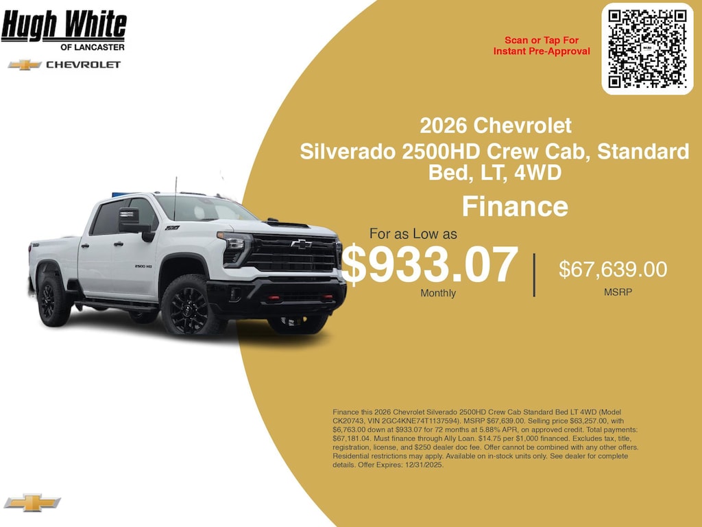 Take advantage of GM Financial programs and Chevrolet Silverado 2500HD Crew Cab, Standard Bed, LT, 4WD incentives today. PLUS, choose from 5 more Silverado 2500HD Crew Cab, Standard Bed, LT, 4WD options for Lancasterâs best lineup. Finance specials end 12/31/2025. Disclaimer: Finance this 2026 Chevrolet Silverado 2500HD Crew Cab Standard Bed LT 4WD (Model CK20743, VIN 2GC4KNE74T1137594). MSRP $67,639.00. Selling price $63,257.00, with $6,763.00 down at $933.07 for 72 months at 5.88% APR, on approved credit. Total payments: $67,181.04. Must finance through Ally Loan. $14.75 per $1,000 financed. Excludes tax, title, registration, license, and $250 dealer doc fee. Offer cannot be combined with any other offers. Residential restrictions may apply. Available on in-stock units only. See dealer for complete details. Offer Expires: 12/31/2025.