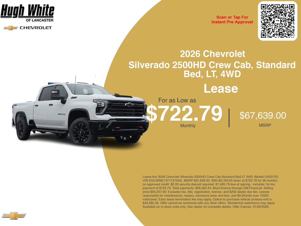 Our GM lease offers combine GM Financial benefits with current Chevrolet Silverado 2500HD Crew Cab, Standard Bed, LT, 4WD incentives. PLUS, explore 5 more Silverado 2500HD Crew Cab, Standard Bed, LT, 4WD options for Lancasterâs best selection. Hurry these GM lease specials end 1/2/2026. Lease this 2026 Chevrolet Silverado 2500HD Crew Cab Standard Bed LT 4WD (Model CK20743; VIN 2GC4KNE74T1137594). MSRP $67,639.00. With $6,763.00 down at $722.79 for 36 months, on approved credit. $0.00 security deposit required. $7,485.79 due at signing - includes 1st mo. payment of $722.79. Total payments: $26,020.44. Must finance through GM Financial. Selling price $64,257.00. Excludes tax, title, registration, license, and $250 dealer doc fee. Lessee responsible for maintenance, repairs, excessive wear and tear, and $0.25/mile over 10000 miles/year. Early lease termination fee may apply. Option to purchase vehicle at lease end is $43,965.35. Offer cannot be combined with any other offers. Residential restrictions may apply. Available on in-stock units only. See dealer for complete details. Offer Expires: 01/02/2026.