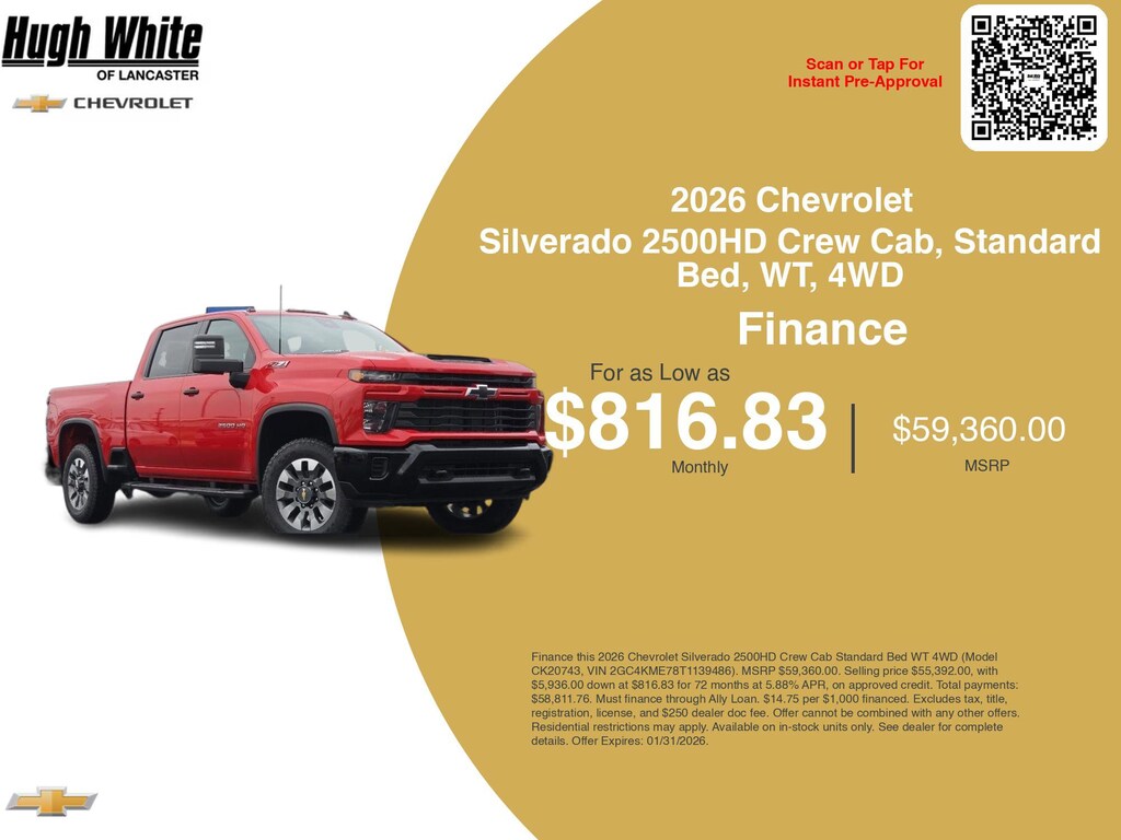 Take advantage of GM Financial programs and Chevrolet Silverado 2500HD Crew Cab, Standard Bed, WT, 4WD incentives today. PLUS, choose from 3 more Silverado 2500HD Crew Cab, Standard Bed, WT, 4WD options for Lancasterâs best lineup. Finance specials end 2/2/2026. Disclaimer: Finance this 2026 Chevrolet Silverado 2500HD Crew Cab Standard Bed WT 4WD (Model CK20743, VIN 2GC4KME78T1139486). MSRP $59,360.00. Selling price $56,392.00, with $5,936.00 down at $734.65 for 84 months at 5.90% APR, on approved credit. Total payments: $61,710.60. Must finance through GM Financial. $13.03 per $1,000 financed. Excludes tax, title, registration, license, and $250 dealer doc fee. Offer cannot be combined with any other offers. Residential restrictions may apply. Available on in-stock units only. See dealer for complete details. Offer Expires: 02/02/2026.