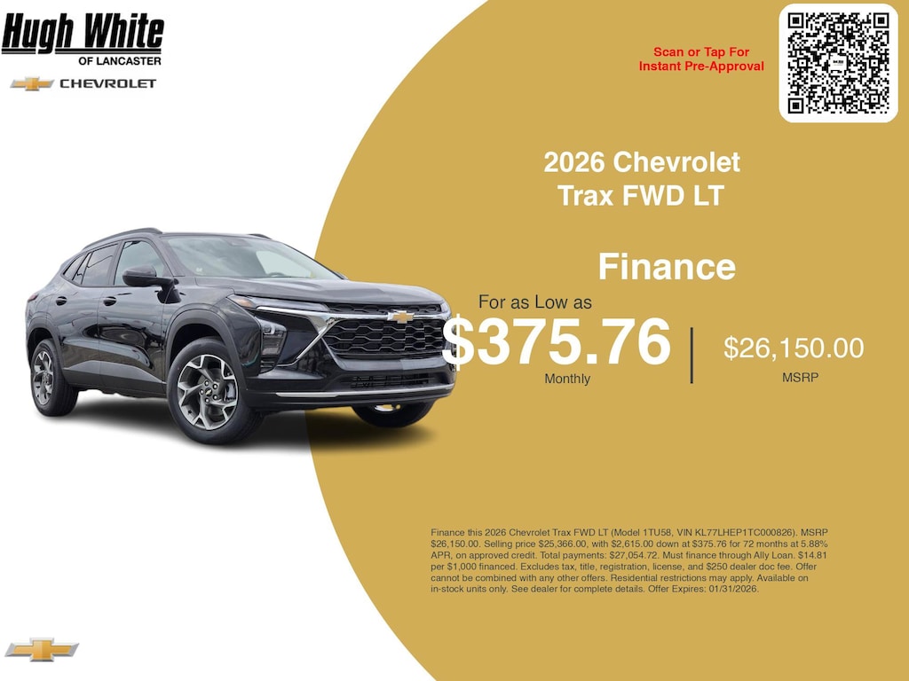 Take advantage of GM Financial programs and Chevrolet Trax FWD LT incentives today. PLUS, choose from 5 more Trax FWD LT options for Lancasterâs best lineup. Finance specials end 1/31/2026. Disclaimer: Finance this 2026 Chevrolet Trax FWD LT (Model 1TU58, VIN KL77LHEP1TC000826). MSRP $26,150.00. Selling price $25,366.00, with $2,615.00 down at $375.76 for 72 months at 5.88% APR, on approved credit. Total payments: $27,054.72. Must finance through Ally Loan. $14.81 per $1,000 financed. Excludes tax, title, registration, license, and $250 dealer doc fee. Offer cannot be combined with any other offers. Residential restrictions may apply. Available on in-stock units only. See dealer for complete details. Offer Expires: 01/31/2026.