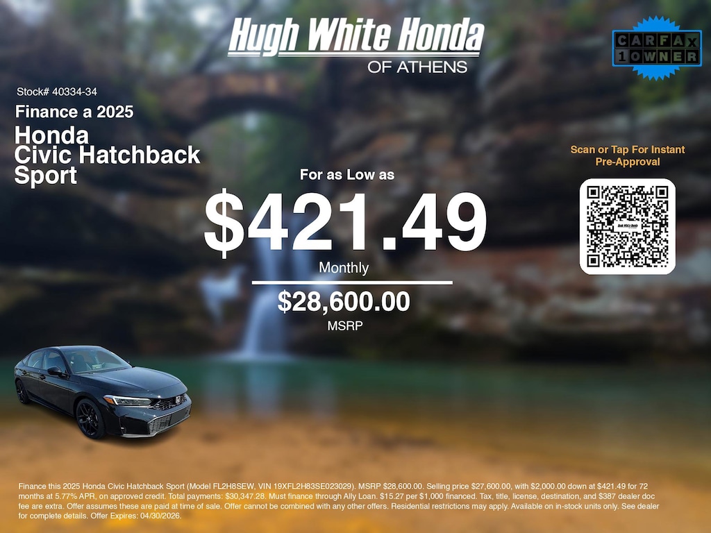 If you're ready to finance a new Honda near Athens, Nelsonville, Logan, and Parkersburg, Hugh White Honda of Athens is thrilled to offer you a competitive finance offer on this 2025 Honda Civic Hatchback Sport. Hereâs how the monthly payment of $421.49 is calculated for well qualified buyers shopping Hugh White Honda of Athens with Tier 1 credit: