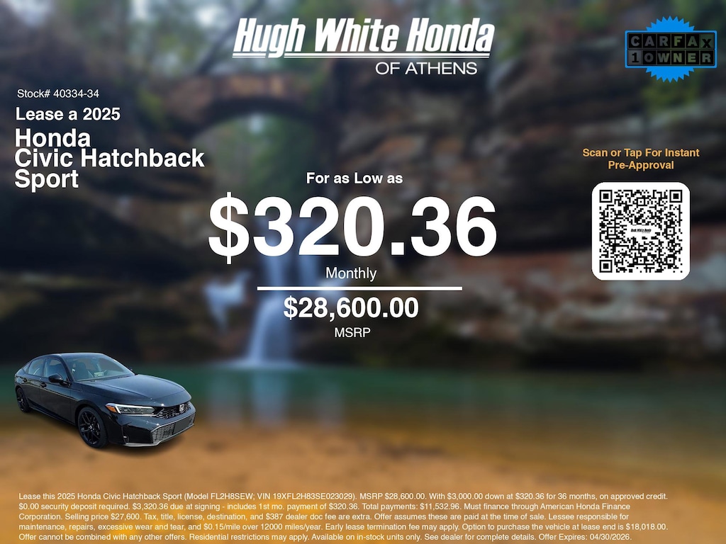 Disclaimer: Lease this 2025 Honda Civic Hatchback Sport (Model FL2H8SEW; VIN 19XFL2H83SE023029). MSRP $28,600.00. With $3,000.00 down at $320.36 for 36 months, on approved credit. $0.00 security deposit required. $3,320.36 due at signing - includes 1st mo. payment of $320.36. Total payments: $11,532.96. Must finance through American Honda Finance Corporation. Selling price $27,600. Tax, title, license, destination, and $387 dealer doc fee are extra. Offer assumes these are paid at the time of sale. Lessee responsible for maintenance, repairs, excessive wear and tear, and $0.15/mile over 12000 miles/year. Early lease termination fee may apply. Option to purchase the vehicle at lease end is $18,018.00. Offer cannot be combined with any other offers. Residential restrictions may apply. Available on in-stock units only. See dealer for complete details. Offer Expires: 04/30/2026.