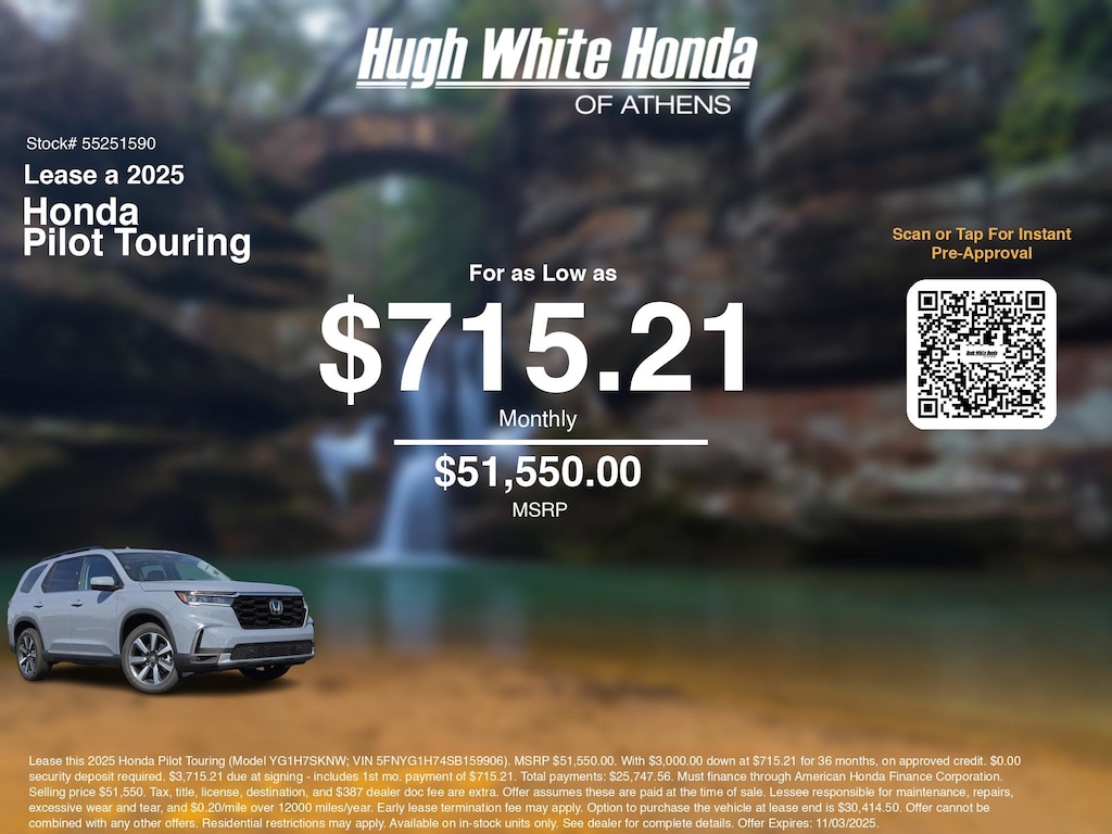 Disclaimer: Lease this 2025 Honda Pilot Touring (Model YG1H7SKNW; VIN 5FNYG1H74SB159906). MSRP $51,550.00. With $3,000.00 down at $715.21 for 36 months, on approved credit. $0.00 security deposit required. $3,715.21 due at signing - includes 1st mo. payment of $715.21. Total payments: $25,747.56. Must finance through American Honda Finance Corporation. Selling price $51,550. Tax, title, license, destination, and $387 dealer doc fee are extra. Offer assumes these are paid at the time of sale. Lessee responsible for maintenance, repairs, excessive wear and tear, and $0.20/mile over 12000 miles/year. Early lease termination fee may apply. Option to purchase the vehicle at lease end is $30,414.50. Offer cannot be combined with any other offers. Residential restrictions may apply. Available on in-stock units only. See dealer for complete details. Offer Expires: 11/03/2025.