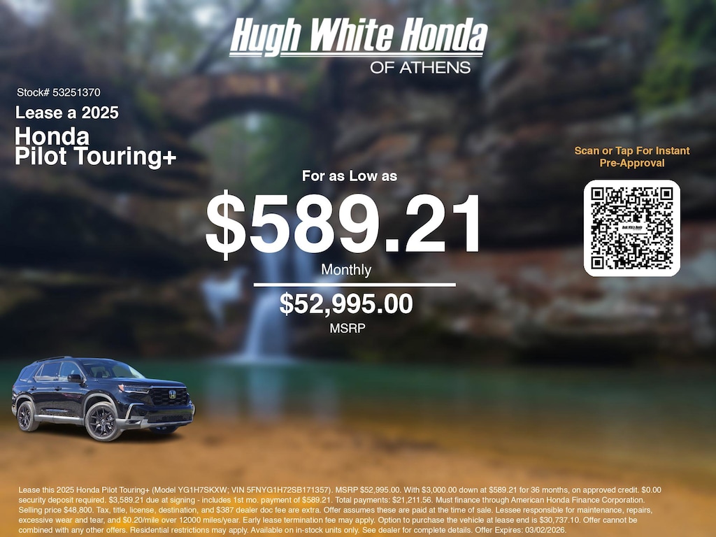 If you're ready to lease a new Honda near Athens, Nelsonville, Logan, and Parkersburg, Hugh White Honda of Athens is thrilled to offer you a competitive lease offer on this 2025 Honda Pilot Touring+. Here is how the monthly payment of $589.21 is calculated for well qualified buyers shopping Hugh White Honda of Athens with Tier 1 credit: