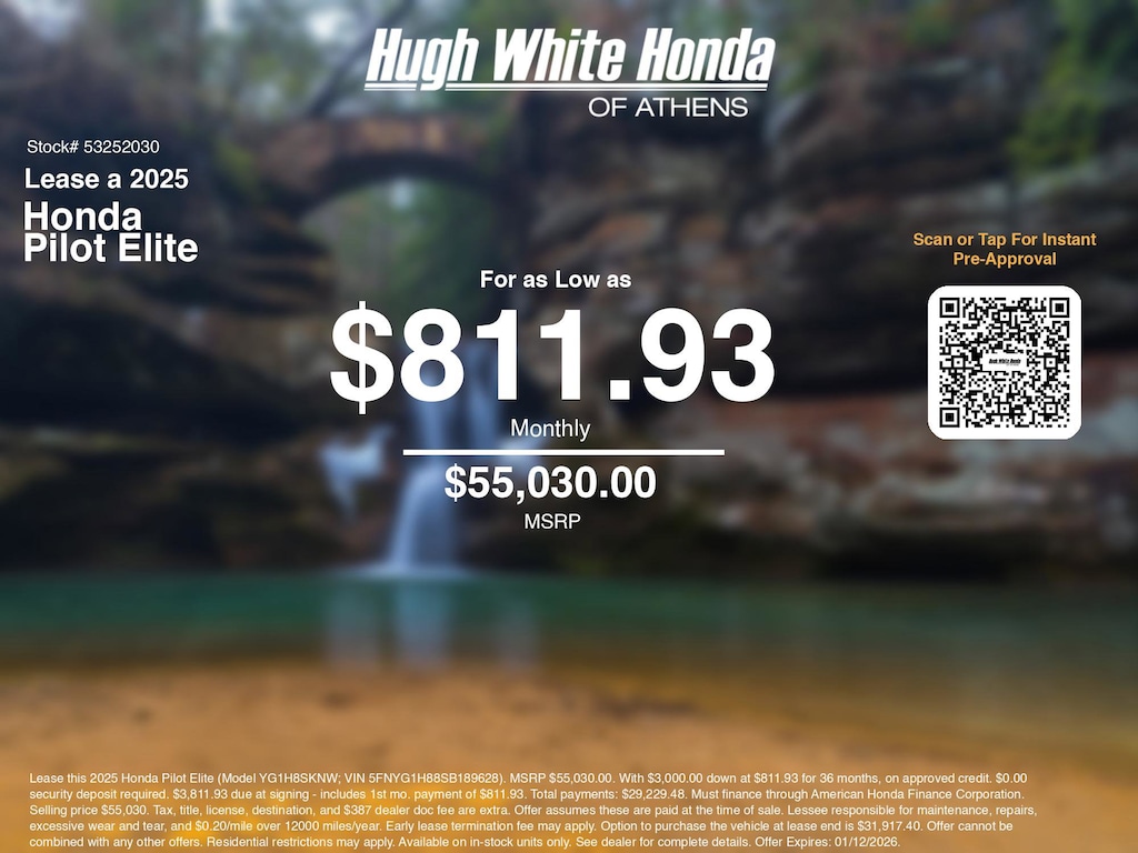 Disclaimer: Lease this 2025 Honda Pilot Elite (Model YG1H8SKNW; VIN 5FNYG1H88SB189628). MSRP $55,030.00. With $3,000.00 down at $811.93 for 36 months, on approved credit. $0.00 security deposit required. $3,811.93 due at signing - includes 1st mo. payment of $811.93. Total payments: $29,229.48. Must finance through American Honda Finance Corporation. Selling price $55,030. Tax, title, license, destination, and $387 dealer doc fee are extra. Offer assumes these are paid at the time of sale. Lessee responsible for maintenance, repairs, excessive wear and tear, and $0.20/mile over 12000 miles/year. Early lease termination fee may apply. Option to purchase the vehicle at lease end is $31,917.40. Offer cannot be combined with any other offers. Residential restrictions may apply. Available on in-stock units only. See dealer for complete details. Offer Expires: 01/12/2026.