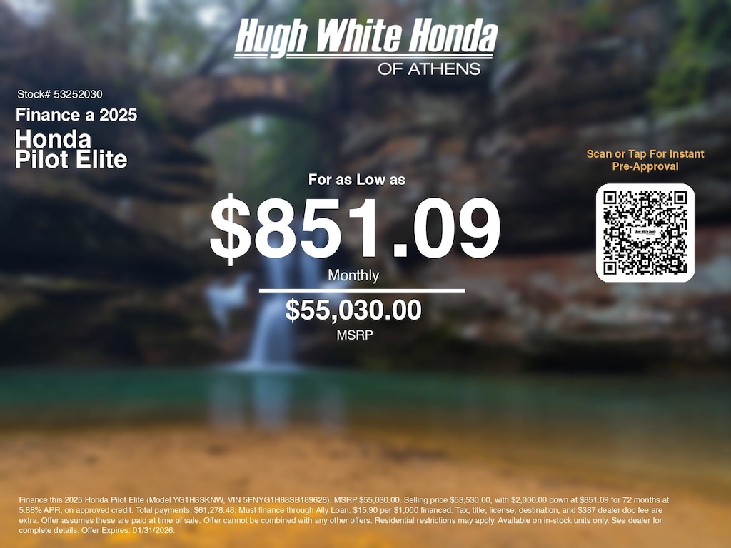 If you're ready to finance a new Honda near Athens, Nelsonville, Logan, and Parkersburg, Hugh White Honda of Athens is thrilled to offer you a competitive finance offer on this 2025 Honda Pilot Elite. Hereâs how the monthly payment of $851.09 is calculated for well qualified buyers shopping Hugh White Honda of Athens with Tier 1 credit: