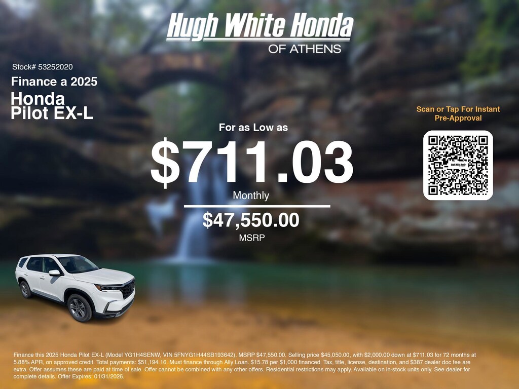 If you're ready to finance a new Honda near Athens, Nelsonville, Logan, and Parkersburg, Hugh White Honda of Athens is thrilled to offer you a competitive finance offer on this 2025 Honda Pilot EX-L. Hereâs how the monthly payment of $711.03 is calculated for well qualified buyers shopping Hugh White Honda of Athens with Tier 1 credit: