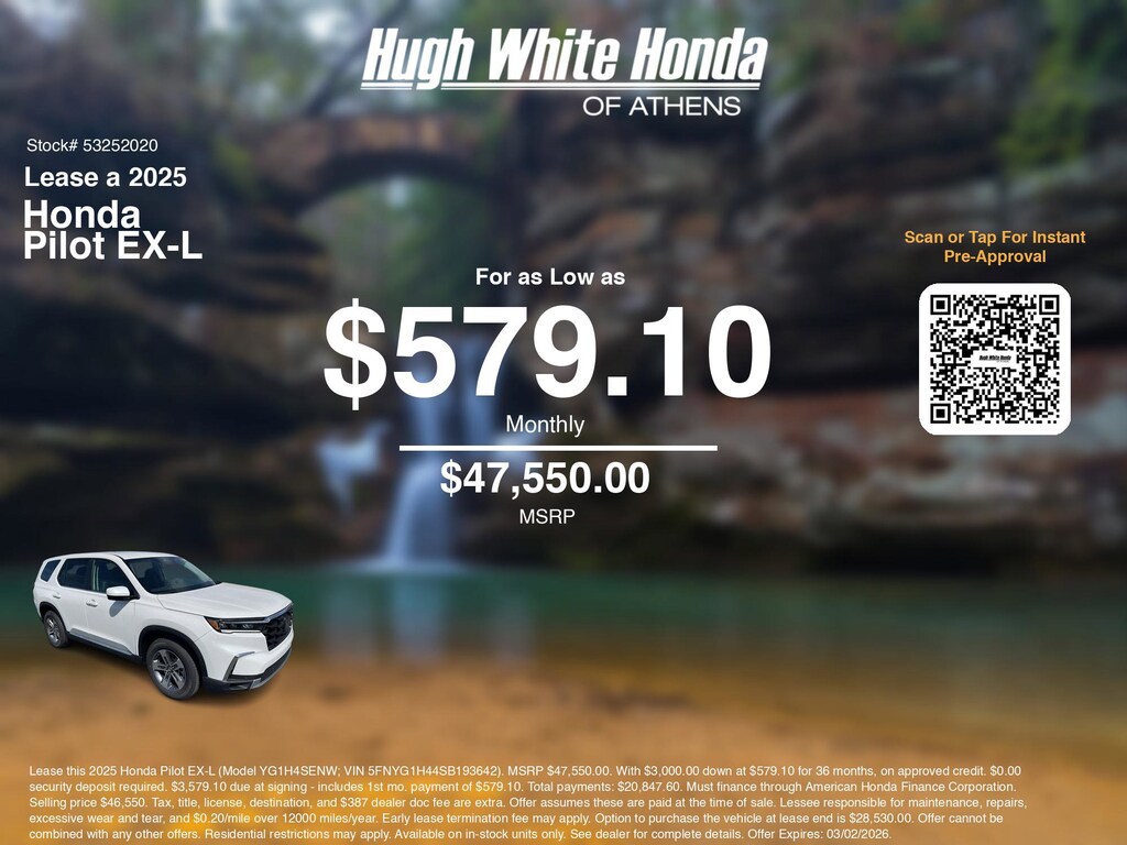 Disclaimer: Lease this 2025 Honda Pilot EX-L (Model YG1H4SENW; VIN 5FNYG1H44SB193642). MSRP $47,550.00. With $3,000.00 down at $579.10 for 36 months, on approved credit. $0.00 security deposit required. $3,579.10 due at signing - includes 1st mo. payment of $579.10. Total payments: $20,847.60. Must finance through American Honda Finance Corporation. Selling price $46,550. Tax, title, license, destination, and $387 dealer doc fee are extra. Offer assumes these are paid at the time of sale. Lessee responsible for maintenance, repairs, excessive wear and tear, and $0.20/mile over 12000 miles/year. Early lease termination fee may apply. Option to purchase the vehicle at lease end is $28,530.00. Offer cannot be combined with any other offers. Residential restrictions may apply. Available on in-stock units only. See dealer for complete details. Offer Expires: 03/02/2026.