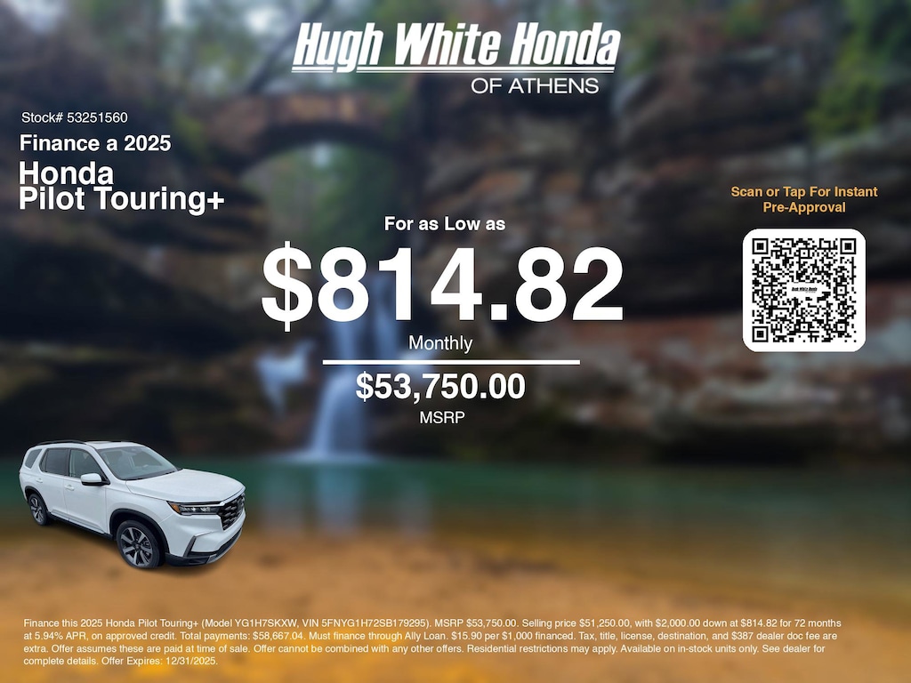 If you're ready to finance a new Honda near Athens, Nelsonville, Logan, and Parkersburg, Hugh White Honda of Athens is thrilled to offer you a competitive finance offer on this 2025 Honda Pilot Touring+. Hereâs how the monthly payment of $814.82 is calculated for well qualified buyers shopping Hugh White Honda of Athens with Tier 1 credit: