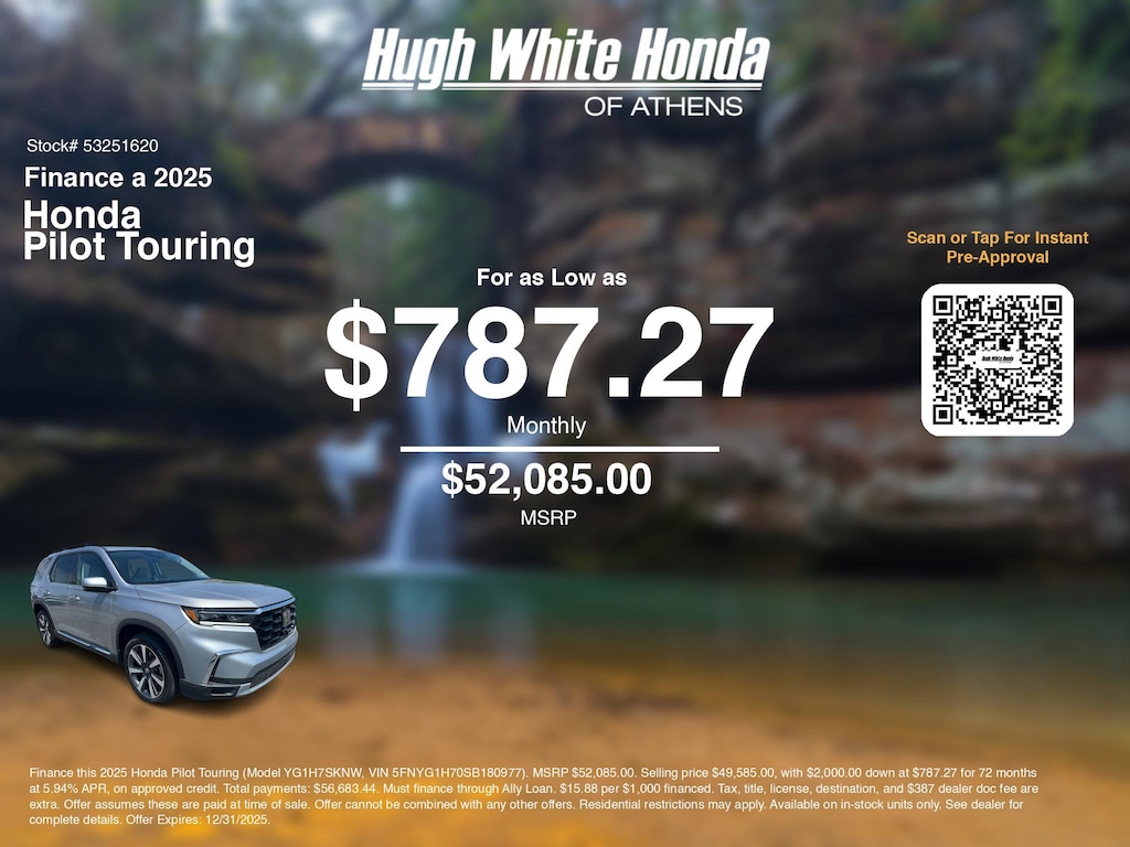 If you're ready to finance a new Honda near Athens, Nelsonville, Logan, and Parkersburg, Hugh White Honda of Athens is thrilled to offer you a competitive finance offer on this 2025 Honda Pilot Touring. Hereâs how the monthly payment of $787.27 is calculated for well qualified buyers shopping Hugh White Honda of Athens with Tier 1 credit: