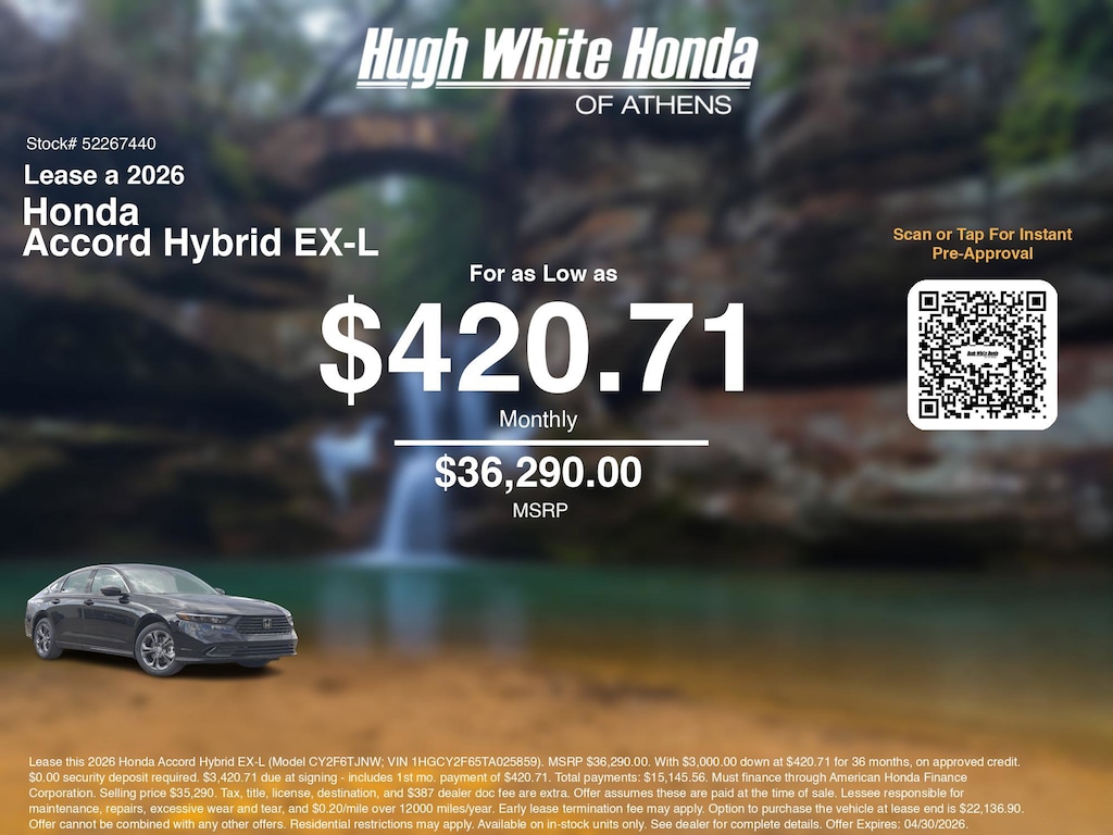 Disclaimer: Lease this 2026 Honda Accord Hybrid EX-L (Model CY2F6TJNW; VIN 1HGCY2F65TA025859). MSRP $36,290.00. With $3,000.00 down at $420.71 for 36 months, on approved credit. $0.00 security deposit required. $3,420.71 due at signing - includes 1st mo. payment of $420.71. Total payments: $15,145.56. Must finance through American Honda Finance Corporation. Selling price $35,290. Tax, title, license, destination, and $387 dealer doc fee are extra. Offer assumes these are paid at the time of sale. Lessee responsible for maintenance, repairs, excessive wear and tear, and $0.20/mile over 12000 miles/year. Early lease termination fee may apply. Option to purchase the vehicle at lease end is $22,136.90. Offer cannot be combined with any other offers. Residential restrictions may apply. Available on in-stock units only. See dealer for complete details. Offer Expires: 04/30/2026.