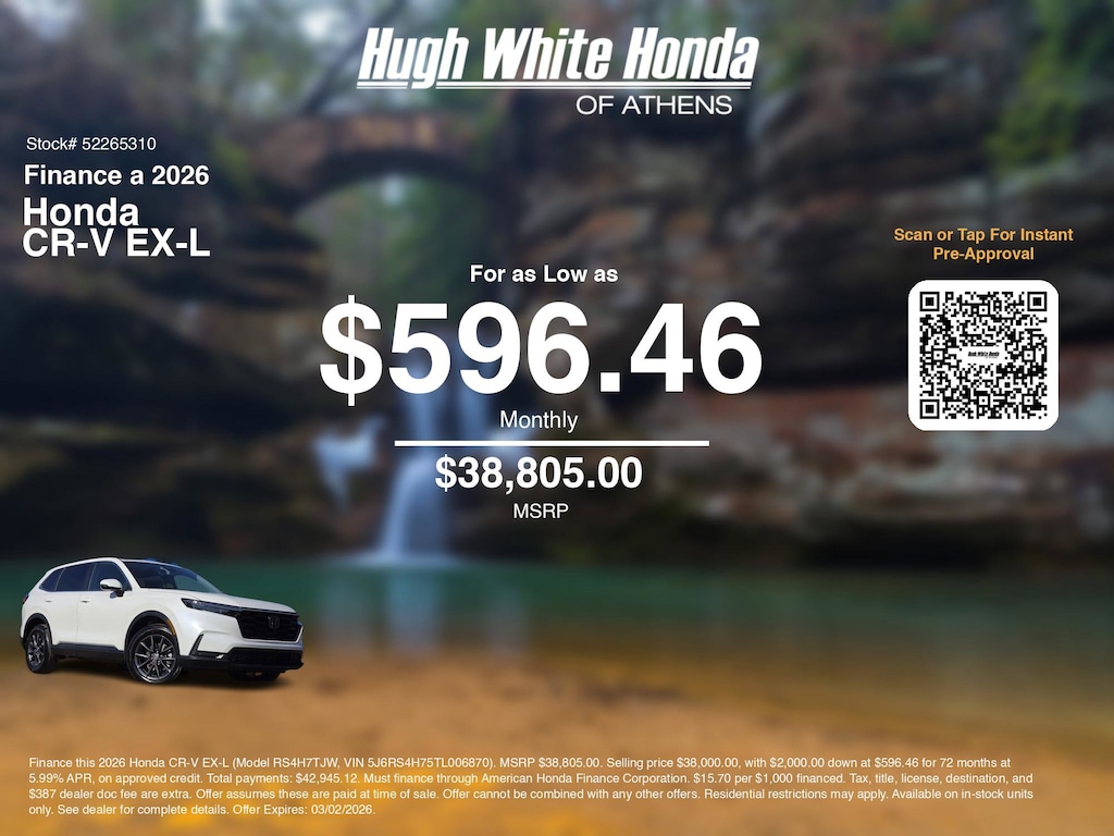 Calculate car payment options using our car monthly payment calculator to explore this and other Honda finance offers that leverage the benefits of Honda Financial Services, along with current Honda CR-V EX-L specials and incentives available. Our car payment estimator can help you budget for your perfect vehicle. Plus, we have 20 other CR-V EX-L options for Athens's best selection. Call or visit us today to discuss car payment options that allow you to drive home this stunning 2026 Honda CR-V, with finance options available near Athens. These Honda finance specials end 3/2/2026