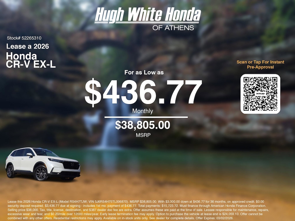 If you're ready to lease a new Honda near Athens, Nelsonville, Logan, and Parkersburg, Hugh White Honda of Athens is thrilled to offer you a competitive lease offer on this 2026 Honda CR-V EX-L. Here is how the monthly payment of $436.77 is calculated for well qualified buyers shopping Hugh White Honda of Athens with Tier 1 credit: