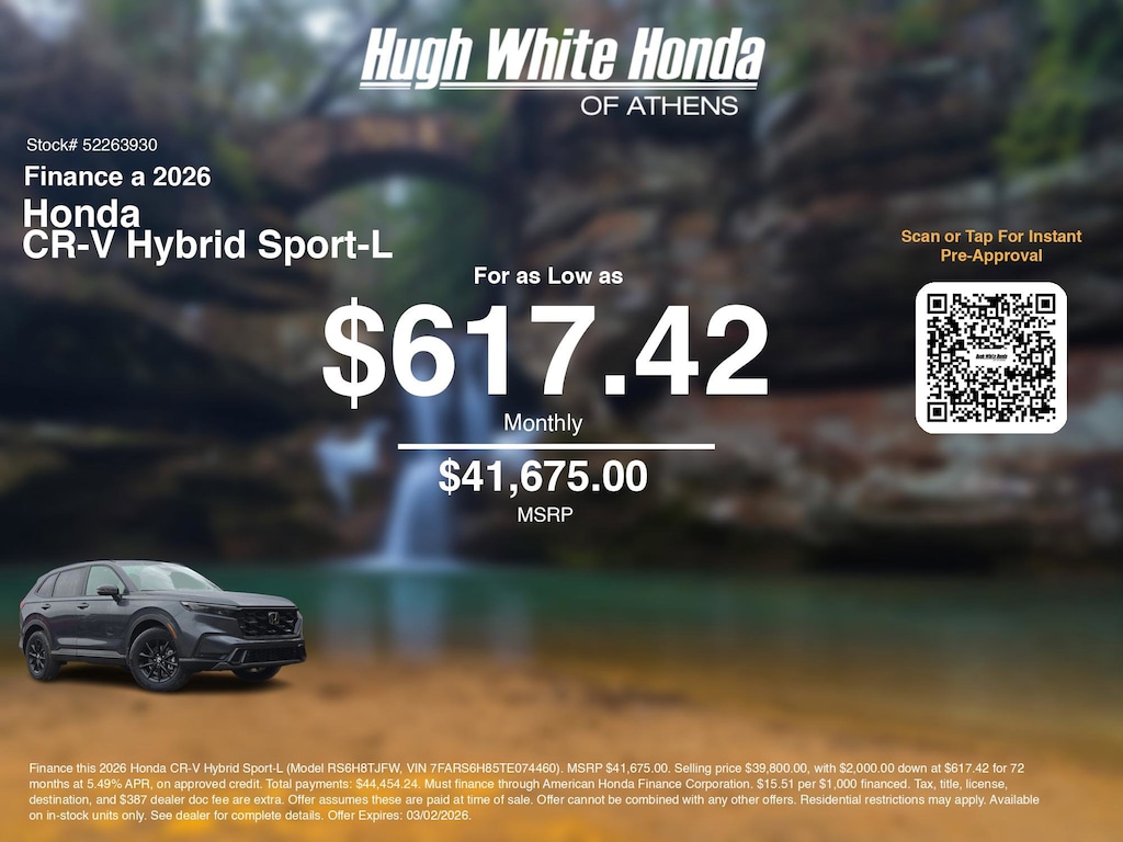 If you're ready to finance a new Honda near Athens, Nelsonville, Logan, and Parkersburg, Hugh White Honda of Athens is thrilled to offer you a competitive finance offer on this 2026 Honda CR-V Hybrid Sport-L. Hereâs how the monthly payment of $617.42 is calculated for well qualified buyers shopping Hugh White Honda of Athens with Tier 1 credit: