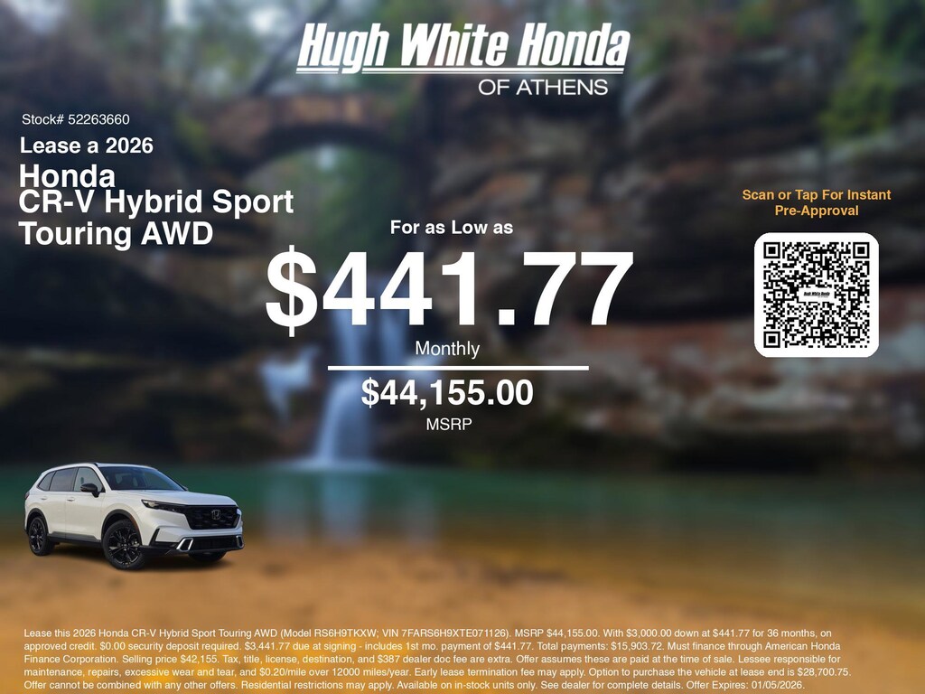 If you're ready to lease a new Honda near Athens, Nelsonville, Logan, and Parkersburg, Hugh White Honda of Athens is thrilled to offer you a competitive lease offer on this 2026 Honda CR-V Hybrid Sport Touring AWD. Here is how the monthly payment of $441.77 is calculated for well qualified buyers shopping Hugh White Honda of Athens with Tier 1 credit: