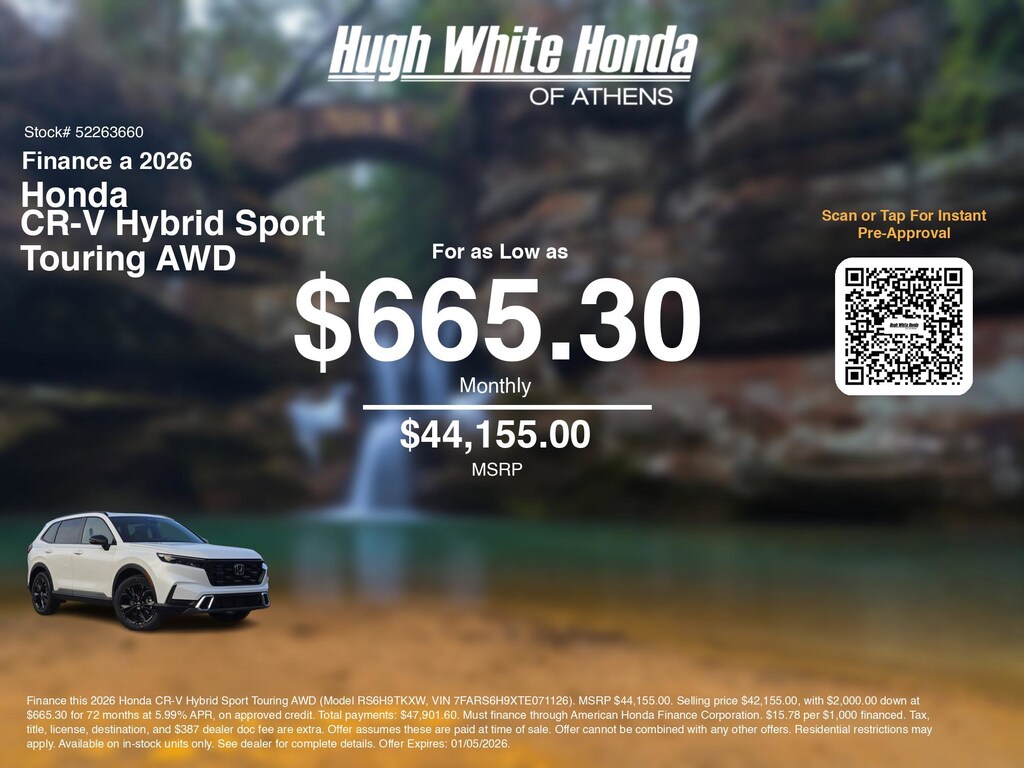 If you're ready to finance a new Honda near Athens, Nelsonville, Logan, and Parkersburg, Hugh White Honda of Athens is thrilled to offer you a competitive finance offer on this 2026 Honda CR-V Hybrid Sport Touring AWD. Hereâs how the monthly payment of $665.30 is calculated for well qualified buyers shopping Hugh White Honda of Athens with Tier 1 credit: