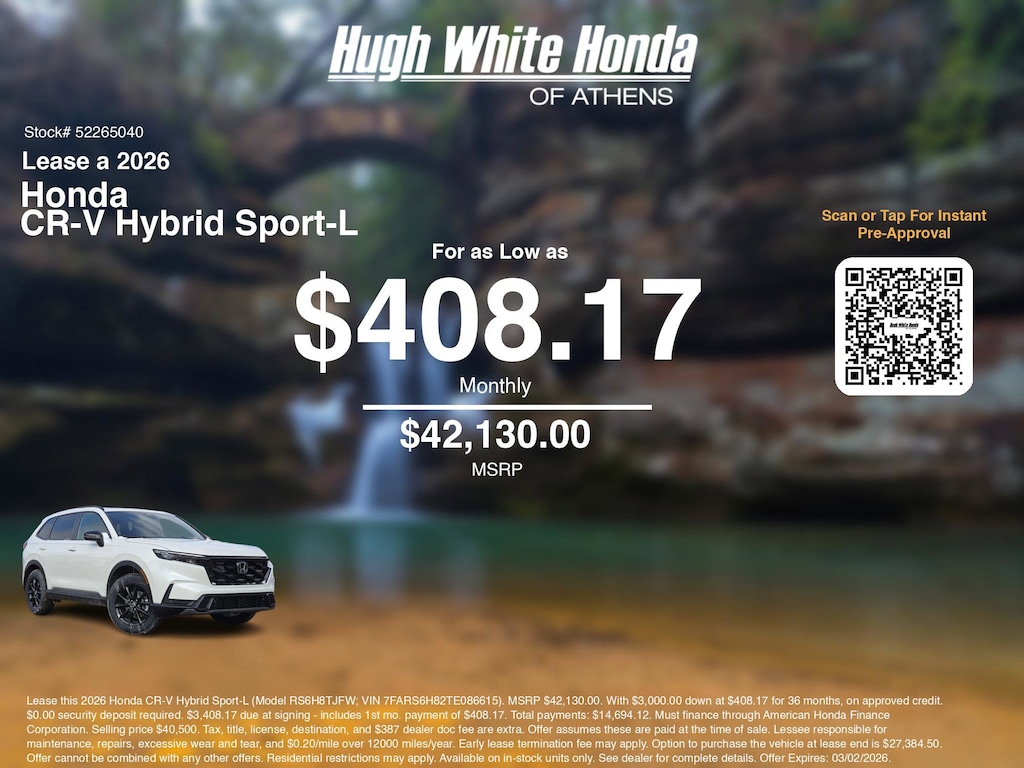 Disclaimer: Lease this 2026 Honda CR-V Hybrid Sport-L (Model RS6H8TJFW; VIN 7FARS6H82TE086615). MSRP $42,130.00. With $3,000.00 down at $408.17 for 36 months, on approved credit. $0.00 security deposit required. $3,408.17 due at signing - includes 1st mo. payment of $408.17. Total payments: $14,694.12. Must finance through American Honda Finance Corporation. Selling price $40,500. Tax, title, license, destination, and $387 dealer doc fee are extra. Offer assumes these are paid at the time of sale. Lessee responsible for maintenance, repairs, excessive wear and tear, and $0.20/mile over 12000 miles/year. Early lease termination fee may apply. Option to purchase the vehicle at lease end is $27,384.50. Offer cannot be combined with any other offers. Residential restrictions may apply. Available on in-stock units only. See dealer for complete details. Offer Expires: 03/02/2026.