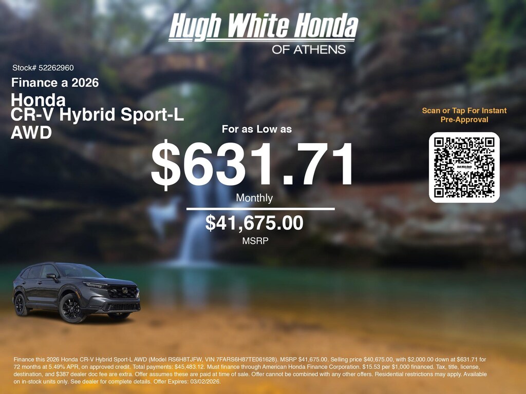 Calculate car payment options using our car monthly payment calculator to explore this and other Honda finance offers that leverage the benefits of Honda Financial Services, along with current Honda CR-V Hybrid Sport-L AWD specials and incentives available. Our car payment estimator can help you budget for your perfect vehicle. Plus, we have 4 other CR-V Hybrid Sport-L AWD options for Athens's best selection. Call or visit us today to discuss car payment options that allow you to drive home this stunning 2026 Honda CR-V Hybrid, with finance options available near Athens. These Honda finance specials end 3/2/2026