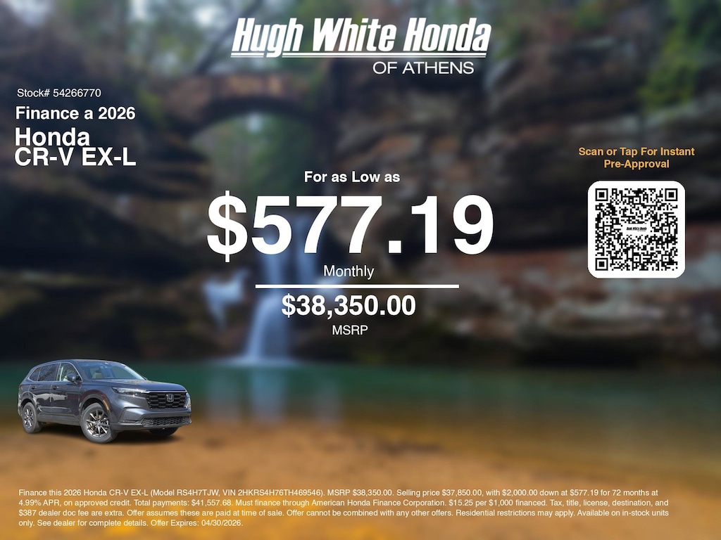 If you're ready to finance a new Honda near Athens, Nelsonville, Logan, and Parkersburg, Hugh White Honda of Athens is thrilled to offer you a competitive finance offer on this 2026 Honda CR-V EX-L. Hereâs how the monthly payment of $577.19 is calculated for well qualified buyers shopping Hugh White Honda of Athens with Tier 1 credit: