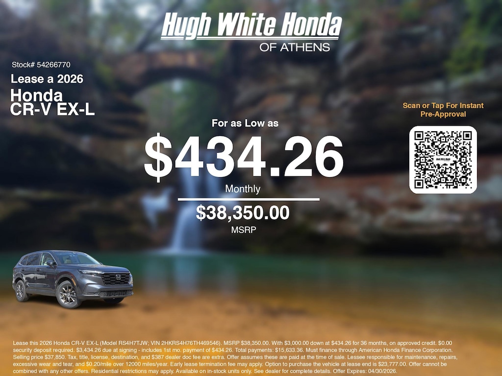 If you're ready to lease a new Honda near Athens, Nelsonville, Logan, and Parkersburg, Hugh White Honda of Athens is thrilled to offer you a competitive lease offer on this 2026 Honda CR-V EX-L. Here is how the monthly payment of $434.26 is calculated for well qualified buyers shopping Hugh White Honda of Athens with Tier 1 credit: