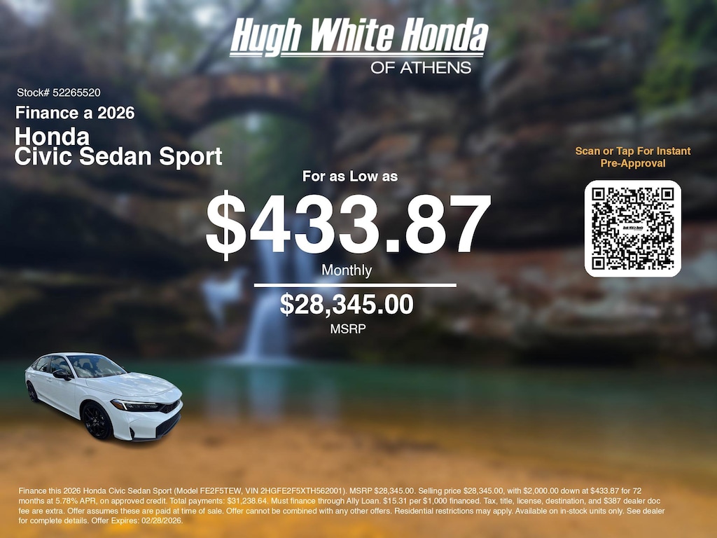 If you're ready to finance a new Honda near Athens, Nelsonville, Logan, and Parkersburg, Hugh White Honda of Athens is thrilled to offer you a competitive finance offer on this 2026 Honda Civic Sedan Sport. Hereâs how the monthly payment of $433.87 is calculated for well qualified buyers shopping Hugh White Honda of Athens with Tier 1 credit:
