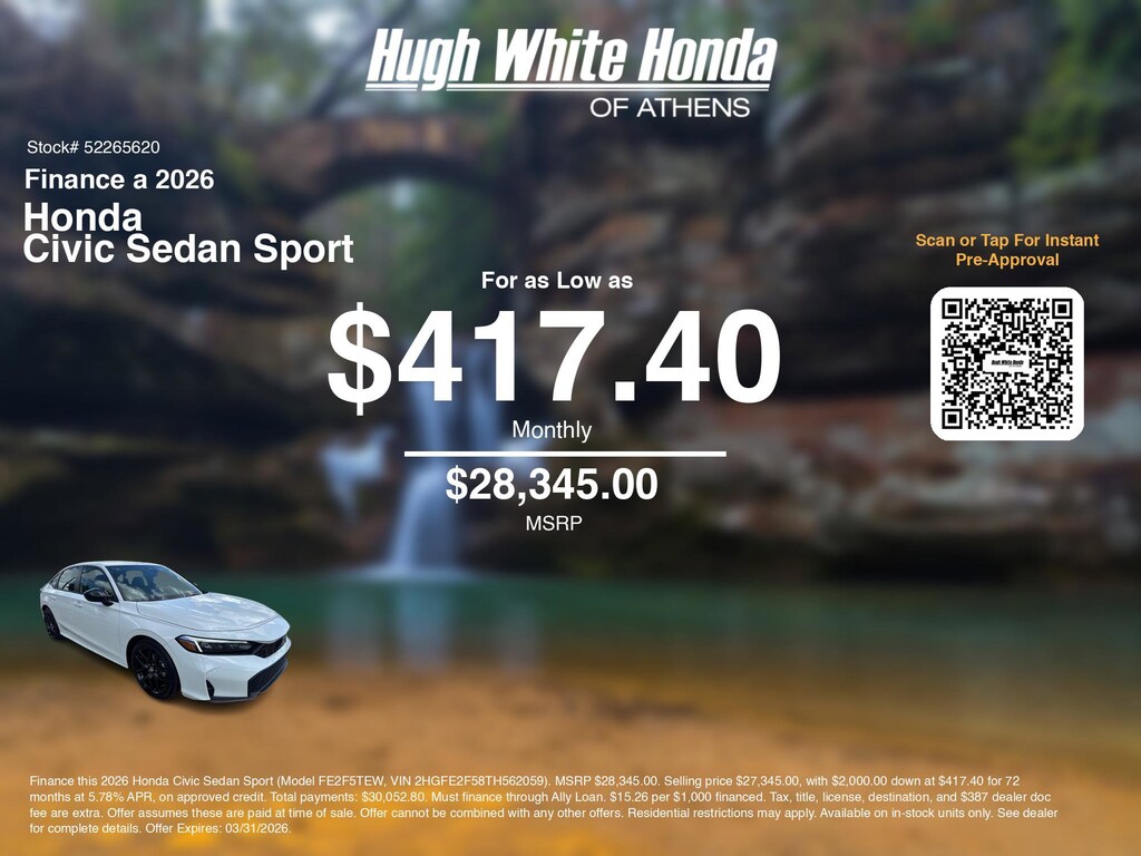 If you're ready to finance a new Honda near Athens, Nelsonville, Logan, and Parkersburg, Hugh White Honda of Athens is thrilled to offer you a competitive finance offer on this 2026 Honda Civic Sedan Sport. Hereâs how the monthly payment of $417.40 is calculated for well qualified buyers shopping Hugh White Honda of Athens with Tier 1 credit: