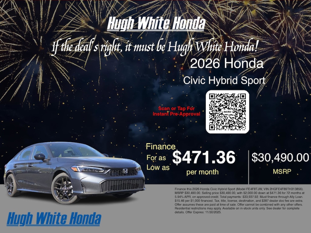 Disclaimer: Finance this 2026 Honda Civic Hybrid Sport (Model FE4F8TJW, VIN 2HGFE4F89TH313856). MSRP $30,490.00. Selling price $30,490.00, with $2,000.00 down at $471.36 for 72 months at 5.94% APR, on approved credit. Total payments: $33,937.92. Must finance through Ally Loan. $15.46 per $1,000 financed. Tax, title, license, destination, and $387 dealer doc fee are extra. Offer assumes these are paid at time of sale. Offer cannot be combined with any other offers. Residential restrictions may apply. Available on in-stock units only. See dealer for complete details. Offer Expires: 11/30/2025.