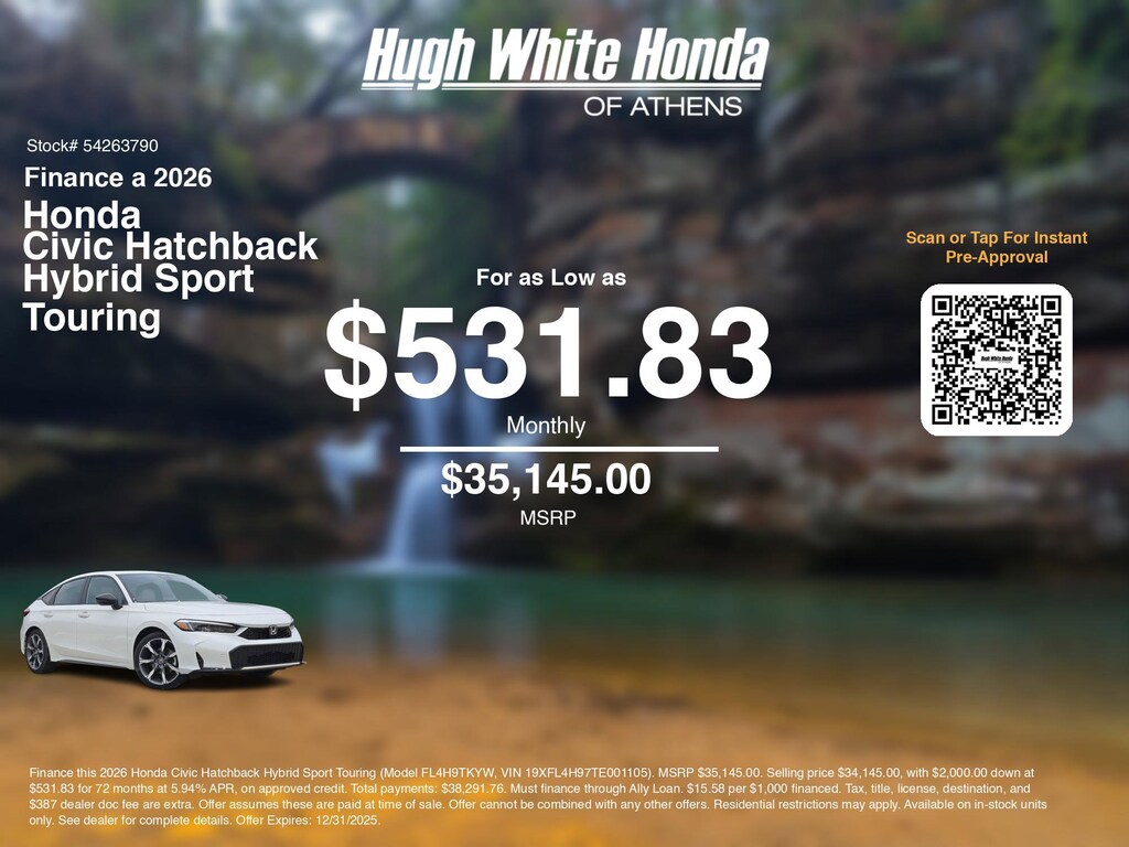 If you're ready to lease a new Honda near Athens, Nelsonville, Logan, and Parkersburg, Hugh White Honda of Athens is thrilled to offer you a competitive lease offer on this 2026 Honda Civic Hatchback Hybrid Sport Touring. Here is how the monthly payment of $351.42 is calculated for well qualified buyers shopping Hugh White Honda of Athens with Tier 1 credit: