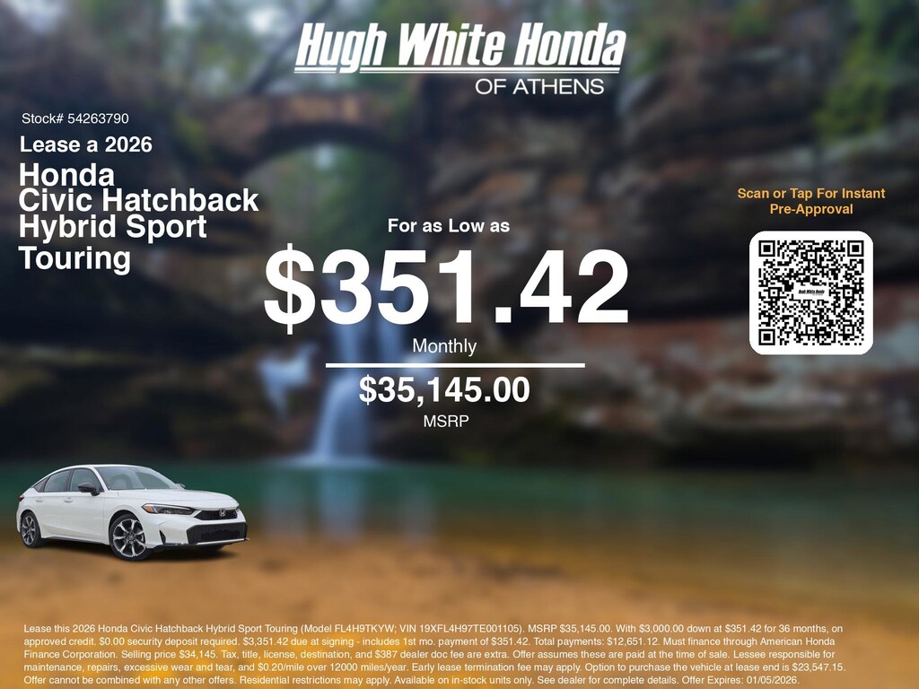 Disclaimer: Lease this 2026 Honda Civic Hatchback Hybrid Sport Touring (Model FL4H9TKYW; VIN 19XFL4H97TE001105). MSRP $35,145.00. With $3,000.00 down at $351.42 for 36 months, on approved credit. $0.00 security deposit required. $3,351.42 due at signing - includes 1st mo. payment of $351.42. Total payments: $12,651.12. Must finance through American Honda Finance Corporation. Selling price $34,145. Tax, title, license, destination, and $387 dealer doc fee are extra. Offer assumes these are paid at the time of sale. Lessee responsible for maintenance, repairs, excessive wear and tear, and $0.20/mile over 12000 miles/year. Early lease termination fee may apply. Option to purchase the vehicle at lease end is $23,547.15. Offer cannot be combined with any other offers. Residential restrictions may apply. Available on in-stock units only. See dealer for complete details. Offer Expires: 01/05/2026.
