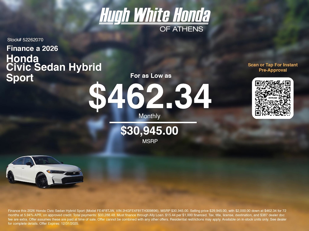 If you're ready to finance a new Honda near Athens, Nelsonville, Logan, and Parkersburg, Hugh White Honda of Athens is thrilled to offer you a competitive finance offer on this 2026 Honda Civic Sedan Hybrid Sport. Hereâs how the monthly payment of $462.34 is calculated for well qualified buyers shopping Hugh White Honda of Athens with Tier 1 credit: