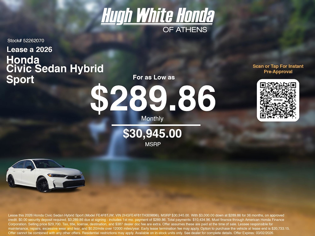 If you're ready to lease a new Honda near Athens, Nelsonville, Logan, and Parkersburg, Hugh White Honda of Athens is thrilled to offer you a competitive lease offer on this 2026 Honda Civic Sedan Hybrid Sport. Here is how the monthly payment of $289.86 is calculated for well qualified buyers shopping Hugh White Honda of Athens with Tier 1 credit: