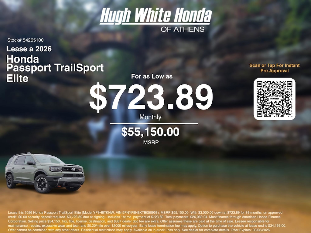 If you're ready to lease a new Honda near Athens, Nelsonville, Logan, and Parkersburg, Hugh White Honda of Athens is thrilled to offer you a competitive lease offer on this 2026 Honda Passport TrailSport Elite. Here is how the monthly payment of $723.89 is calculated for well qualified buyers shopping Hugh White Honda of Athens with Tier 1 credit: