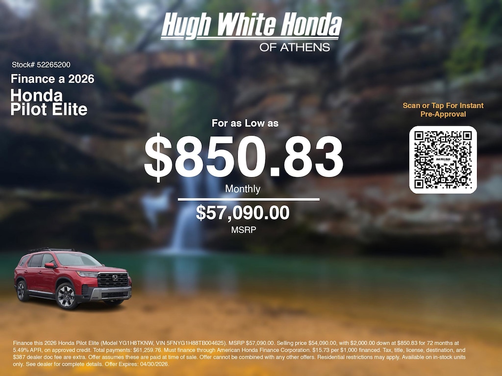 If you're ready to finance a new Honda near Athens, Nelsonville, Logan, and Parkersburg, Hugh White Honda of Athens is thrilled to offer you a competitive finance offer on this 2026 Honda Pilot Elite. Hereâs how the monthly payment of $850.83 is calculated for well qualified buyers shopping Hugh White Honda of Athens with Tier 1 credit:
