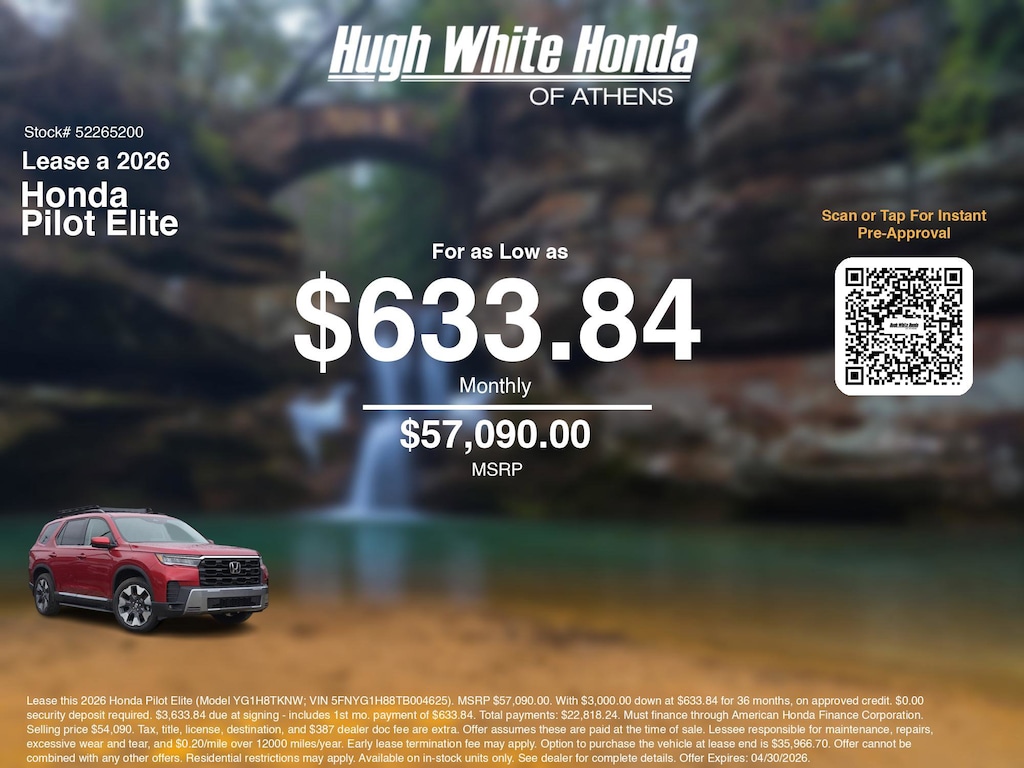 Disclaimer: Lease this 2026 Honda Pilot Elite (Model YG1H8TKNW; VIN 5FNYG1H88TB004625). MSRP $57,090.00. With $3,000.00 down at $633.84 for 36 months, on approved credit. $0.00 security deposit required. $3,633.84 due at signing - includes 1st mo. payment of $633.84. Total payments: $22,818.24. Must finance through American Honda Finance Corporation. Selling price $54,090. Tax, title, license, destination, and $387 dealer doc fee are extra. Offer assumes these are paid at the time of sale. Lessee responsible for maintenance, repairs, excessive wear and tear, and $0.20/mile over 12000 miles/year. Early lease termination fee may apply. Option to purchase the vehicle at lease end is $35,966.70. Offer cannot be combined with any other offers. Residential restrictions may apply. Available on in-stock units only. See dealer for complete details. Offer Expires: 04/30/2026.
