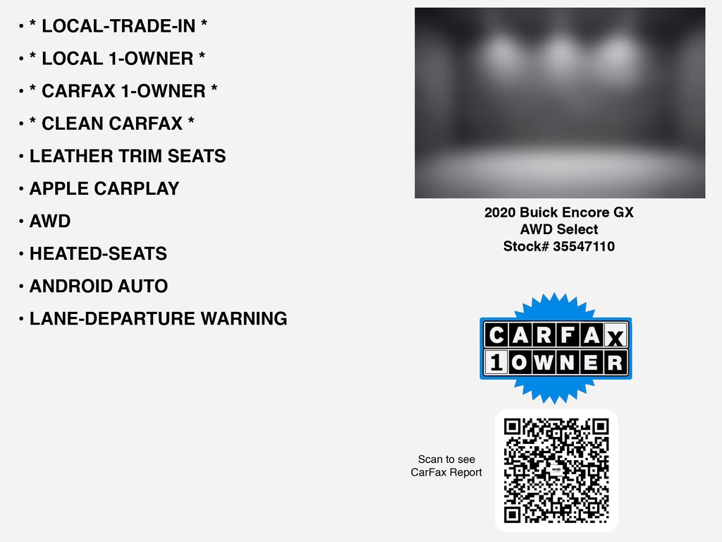 CARFAX VERIFIED 1-OWNER. Free CARFAX report! DESIRABLE FEATURES: * CARFAX 1-OWNER *, * LOCAL-TRADE-IN *, * CLEAN CARFAX *, * LOCAL 1-OWNER *, AWD, LEATHER TRIM SEATS, APPLE CARPLAY, HEATED-SEATS, ANDROID AUTO, LANE-DEPARTURE WARNING, MULTI-ZONE AC, BLUETOOTH, BACKUP CAMERA, FOG LAMPS, ALLOY-WHEELS, Remote entry, usb, SiriusXM. Your 2020 Buick Encore GX AWD Select is perfect for daily work or weekend road trips to our neighboring communities of Lancaster, Columbus, Newark, Pickerington, and Logan.Hugh White Chevrolet of Lancaster also offers extended vehicle service contracts so our Lancaster, OH area drivers enjoy a worry-free used car, SUV or van ownership experience. We proudly serve the counties of Fairfield, Hocking, Perry, Licking, and Pickaway with quality pre-owned vehicles Ohio drivers can trust.