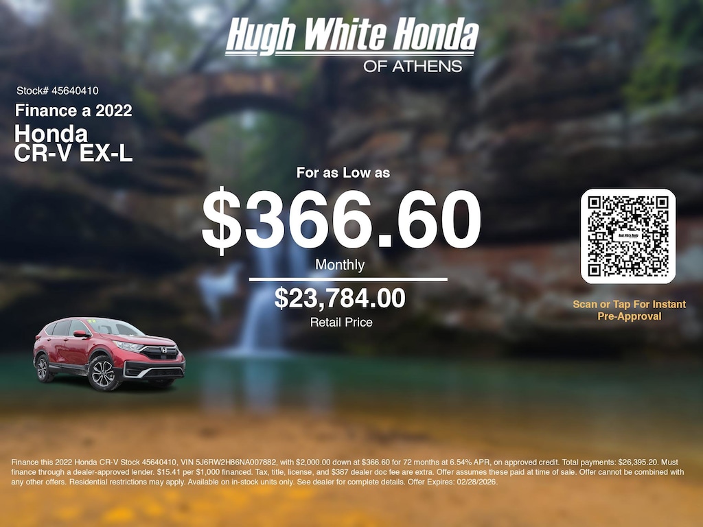 If you're ready to finance a quality used vehicle near Athens, Nelsonville, Logan, and Parkersburg, Hugh White Honda of Athens is thrilled to offer you a competitive finance offer on this 2022 Honda CR-V EX-L. Use our car payment calculator to estimate your monthly payments or see how the monthly payment of $366.60 is calculated for well-qualified buyers shopping at Hugh White Honda of Athens with Tier 1 credit: