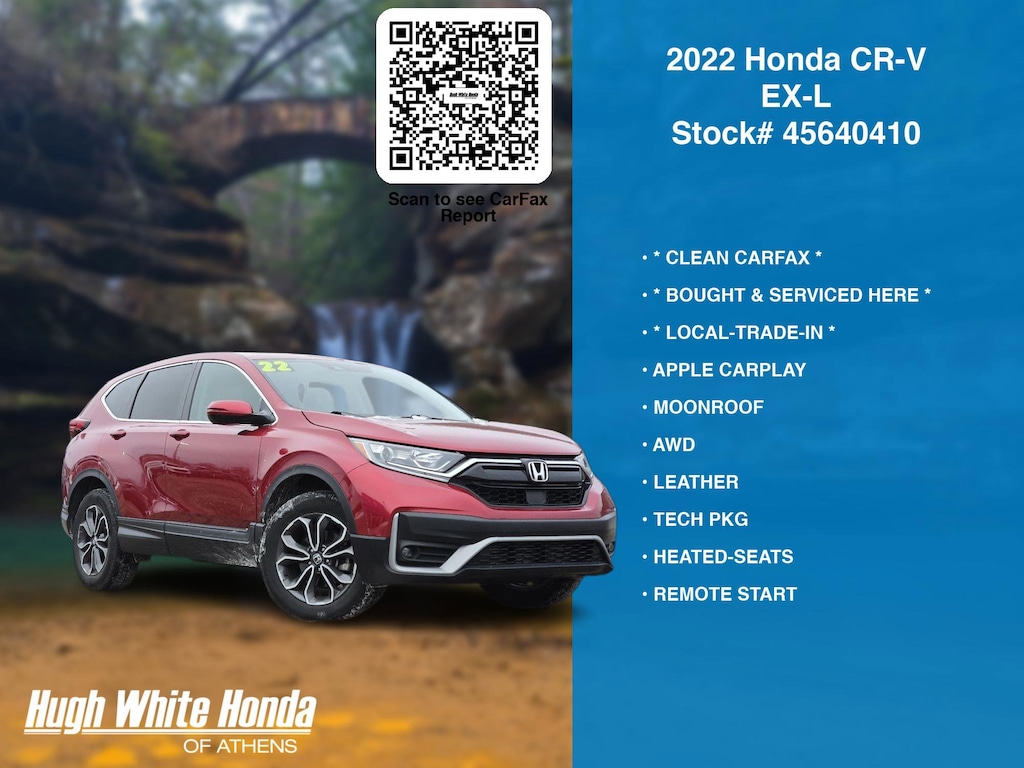 Free CARFAX report! DESIRABLE FEATURES: * BOUGHT & SERVICED HERE *, * LOCAL-TRADE-IN *, MOONROOF, LEATHER, AWD, APPLE CARPLAY, CLEAN CARFAX, TECH PKG, ANDROID AUTO, LANE-DEPARTURE WARNING, HEATED-SEATS, REMOTE START, TURBO, KEYLESS-START, POWER LIFT-GATE, BACKUP CAMERA, BLUETOOTH, HANDS-FREE LIFTGATE, BLIND-SPOT MONITORING, HOMELINK, FOG LAMPS, ALLOY-WHEELS, MULTI-ZONE AC, SiriusXM, Remote entry. Your 2022 Honda CR-V EX-L is perfect for daily work or weekend road trips to our neighboring communities of Athens.