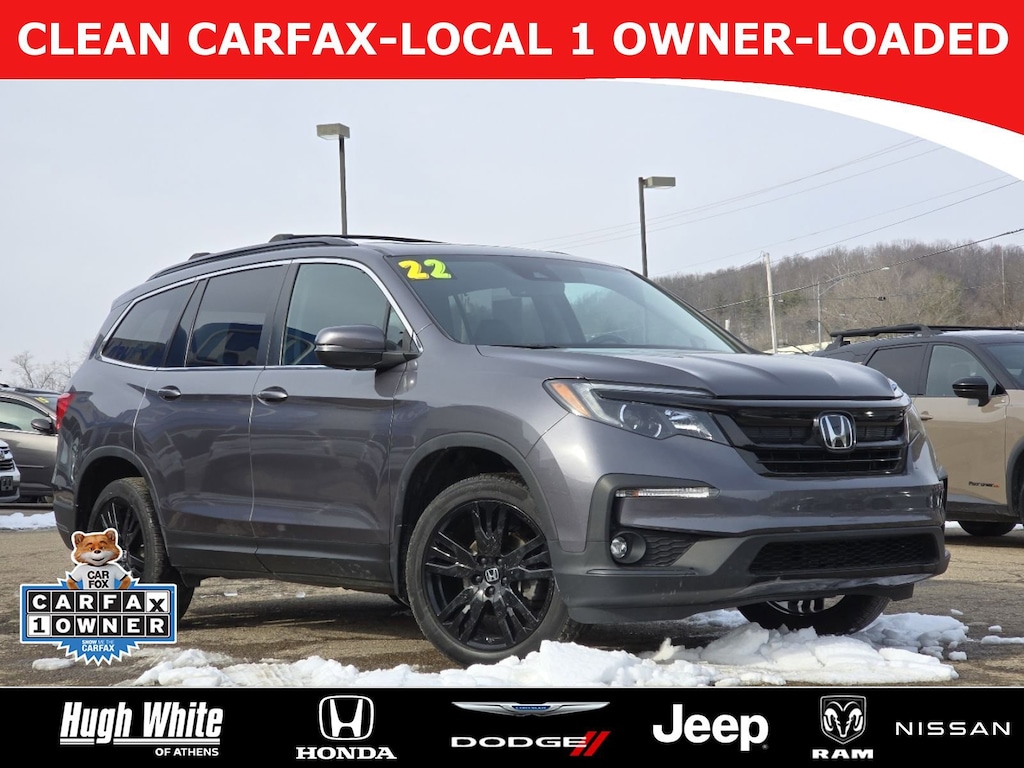 CARFAX VERIFIED 1-OWNER. Free CARFAX report! DESIRABLE FEATURES: * CARFAX 1-OWNER *, * BOUGHT & SERVICED HERE *, * LOCAL-TRADE-IN *, * LOCAL 1-OWNER *, LEATHER, AWD, APPLE CARPLAY, MOONROOF, SOLD HERE NEW, REMOTE START, HEATED-SEATS, TECH PKG, ANDROID AUTO, LANE-DEPARTURE WARNING, KEYLESS-START, 3RD ROW SEAT, HANDS-FREE LIFTGATE, BACKUP CAMERA, WIRELESS PHONE CHARGING, BLIND-SPOT MONITORING, POWER LIFT-GATE, BLUETOOTH, HOMELINK, MULTI-ZONE AC, FOG LAMPS, ALLOY-WHEELS, SiriusXM, Remote entry. Your 2022 Honda Pilot Special Edition AWD is perfect for daily work or weekend road trips to our neighboring communities of Athens.Hugh White Athens also offers extended vehicle service contracts so our Athens, OH area drivers enjoy a worry free used car, SUV or van ownership experience.
