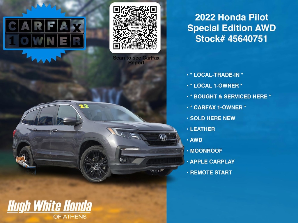 Our Car Dealership in Athens, OH: Call Hugh White Athens today at (844) 859-8630 TO SCHEDULE YOUR TEST DRIVE of this 2022 Honda Pilot Special Edition AWD. You can also visit us at 250 Columbus Road. Athens, OH 45701 to check it out in person! Our Hugh White Athens Used car dealership only sells used cars Athens, OH buyers can trust for safety and worry free driving.