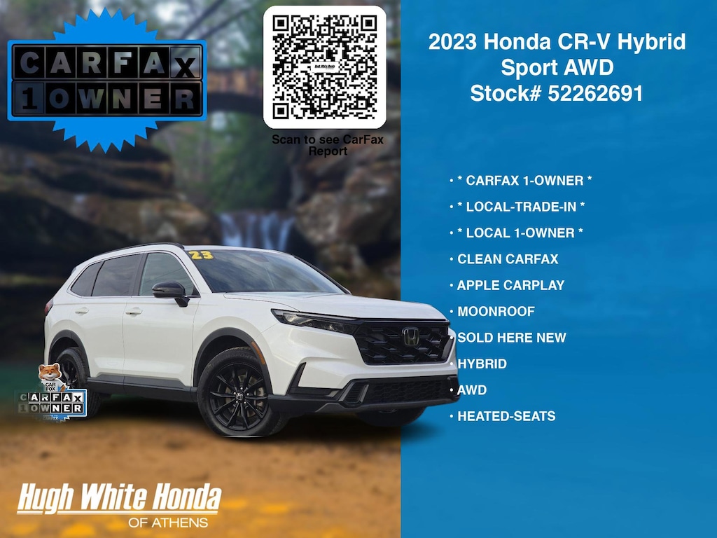 CARFAX VERIFIED 1-OWNER. Free CARFAX report! DESIRABLE FEATURES: * LOCAL 1-OWNER *, * LOCAL-TRADE-IN *, * CARFAX 1-OWNER *, SOLD HERE NEW, APPLE CARPLAY, HYBRID, MOONROOF, CLEAN CARFAX, AWD, LANE-DEPARTURE WARNING, HEATED-SEATS, ANDROID AUTO, REMOTE START, BACKUP CAMERA, BLIND-SPOT MONITORING, BLUETOOTH, MULTI-ZONE AC. Your 2023 Honda CR-V Hybrid Sport AWD is perfect for daily work or weekend road trips to our neighboring communities of Athens.Hugh White Athens also offers extended vehicle service contracts so our Athens, OH area drivers enjoy a worry free used car, SUV or van ownership experience.