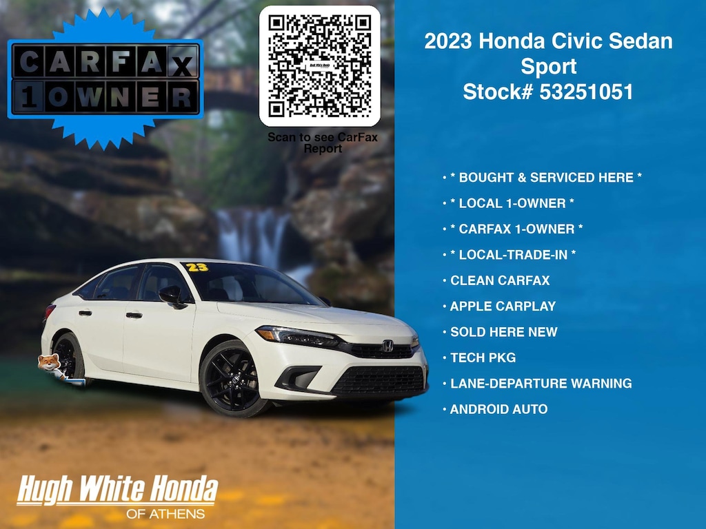 CARFAX VERIFIED 1-OWNER. Free CARFAX report! DESIRABLE FEATURES: * LOCAL 1-OWNER *, * CARFAX 1-OWNER *, * BOUGHT & SERVICED HERE *, * LOCAL-TRADE-IN *, CLEAN CARFAX, APPLE CARPLAY, SOLD HERE NEW, REMOTE START, LANE-DEPARTURE WARNING, TECH PKG, ANDROID AUTO, KEYLESS-START, BACKUP CAMERA, BLUETOOTH, ALLOY-WHEELS, Remote entry. Your 2023 Honda Civic Sedan Sport is perfect for daily work or weekend road trips to our neighboring communities of Athens.Hugh White Athens also offers extended vehicle service contracts so our Athens, OH area drivers enjoy a worry free used car, SUV or van ownership experience.